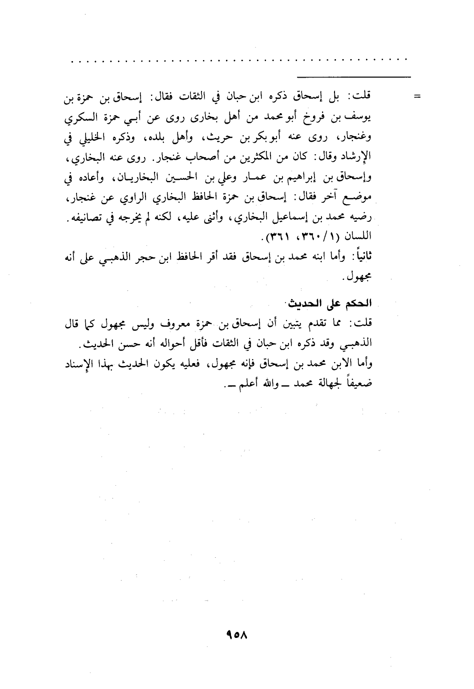 = قلت: بل إسحاق ذكره ابن حبان في الثقات فقال: إسحاق بن حمزة بن يوسف بن فروخ أبو محمد من أهل بخارى روى عن أبي حمزة السكري وغنجار، روى عنه أبو بكر بن حريث، وأهل بلده، وذكره الخليلي في الإِرشاد وقال: كان من المكثرين من أصحاب غنجار. روى عنه البخاري، وإسحاق بن إبراهيم بن عمار وعلي بن الحسين البخاريان، وأعاده في موضع آخر فقال: إسحاق بن حمزة الحافظ البخاري الراوي عن غنجار، رضيه محمد بن إسماعيل البخاري، وأثنى عليه، لكنه لم يخرجه في تصانيفه. اللسان (1/ 360، 361).