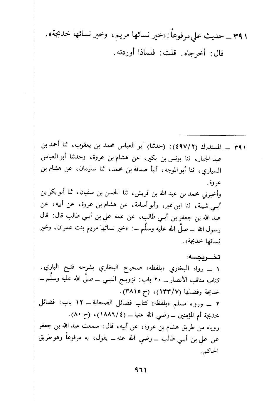 391 - حديث علي مرفوعاً: "خير نسائها مريم، وخير نسائها خديجة".