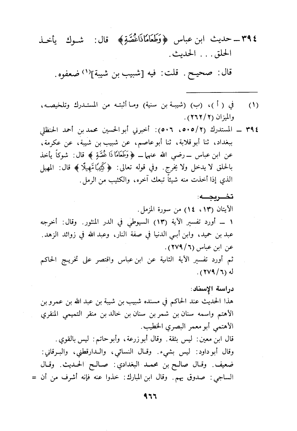 394 - المستدرك (2/ 505، 506): أخبرني أبو الحسين محمد بن أحمد الحنظلي ببغداد، ثنا أبو قلابة، ثنا أبو عاصم، عن شبيب بن شيبة، عن عكرمة، عن ابن عباس -رضي الله عنهما- {(وَطَعَاماً ذا غُصَّةٍ} قال: شوكاً يأخذ بالحلق لا يدخل ولا يخرج. وفي قوله تعالى: {كَثِيباً مَّهِيلاً} قال: المهيل الذي إذا أخذت منه شيئاً تبعك آخره، والكثيب من الرمل.