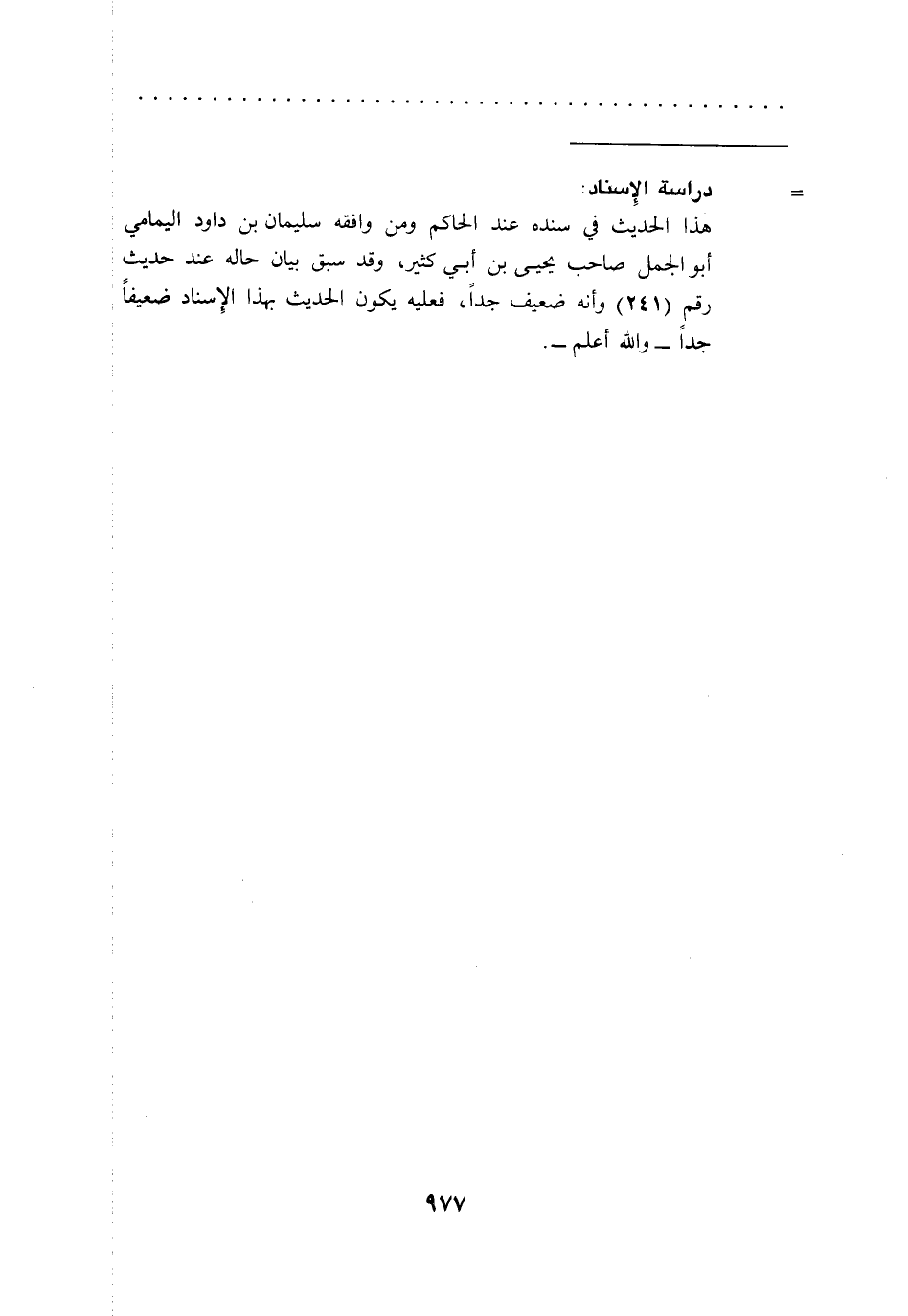 هذا الحديث في سنده عند الحاكم ومن وافقه سليمان بن داود اليمامي أبو الجمل صاحب يحيى بن أبي كثير، وقد سبق بيان حاله عند حديث رقم (241) وأنه ضعيف جداً، فعليه يكون الحديث بهذا الإِسناد ضعيفاً جداً -والله أعلم-.