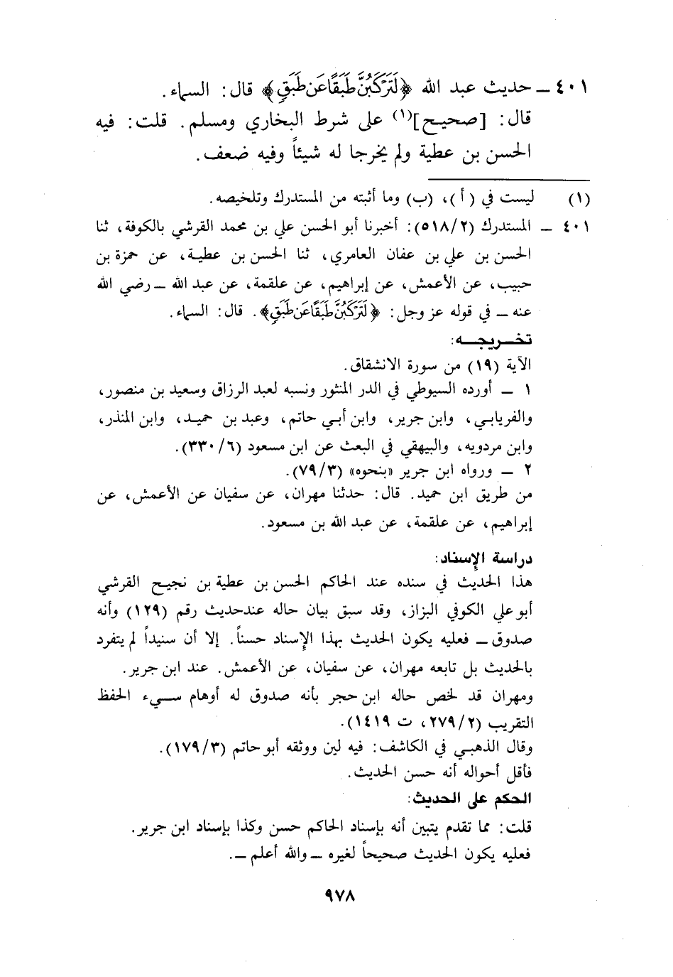 401 - المستدرك (2/ 518): أخبرنا أبو الحسن علي بن محمد القرشي بالكوفة، ثنا الحسن بن علي بن عفان العامري، ثنا الحسن بن عطية، عن حمزة بن حبيب، عن الأعمش، عن إبراهيم، عن علقمة، عن عبد الله -رضي الله عنه- في قوله عز وجل: {لَتَركَبن طَبَقًا عَن طَبَقِ}. قال: السماء.
