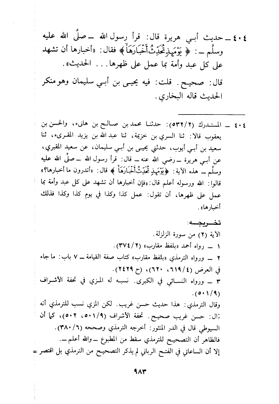 404 - حديث أبي هريرة قال: قرأ رسول الله -صلَّى الله عليه وسلَّم-: {يَوْمَئِذٍ تُحَدِّثُ أَخْبَارَهَا (4)} [الزلزلة: 4] فقال: "أخبارها أن تشهد على كل عبد وأمة بما عمل على ظهرها ... الحديث".