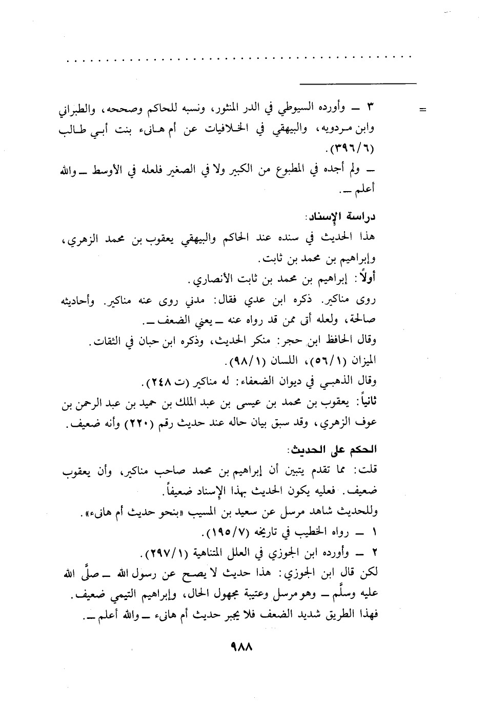 قلت: مما تقدم يتبين أن إبراهيم بن محمد صاحب مناكير، وأن يعقوب ضعيف. فعليه يكون الحديث بهذا الِإسناد ضعيفاً.