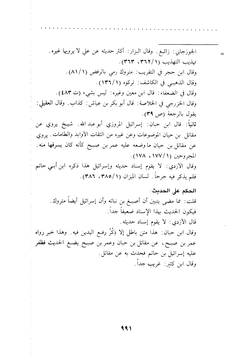 وقال الأزدي: لا يقوم إسناد حديثه وإسرائيل هذا ذكره ابن أبي حاتم فلم يذكر فيه جرحاً. لسان الميزان (1/ 385، 386).