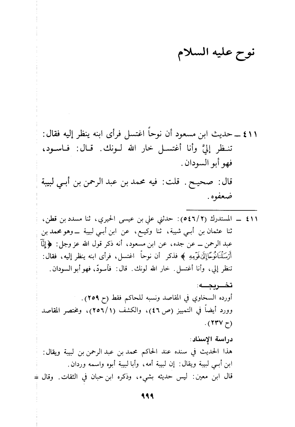 411 - المستدرك (2/ 546): حدثني علي بن عيسى الحيري، ثنا مسدد بن قطن، ثنا عثمان بن أبي شيبة، ثنا وكيع، عن ابن أبي لبيبة -وهو محمد بن عبد الرحمن- عن جده، عن ابن مسعود، أنه ذكر قول الله عز وجل: {إِنَّا أَرْسَلْنَا نُوحًا إِلَى قَوْمِهِ (1)} [نوح: 1] فذكر أن نوحاً اغتسل، فرأى ابنه ينظر إليه، فقال: تنظر إلي، وأنا أغتسل. خار الله لونك. قال: فاسودّ، فهو أبو السودان.