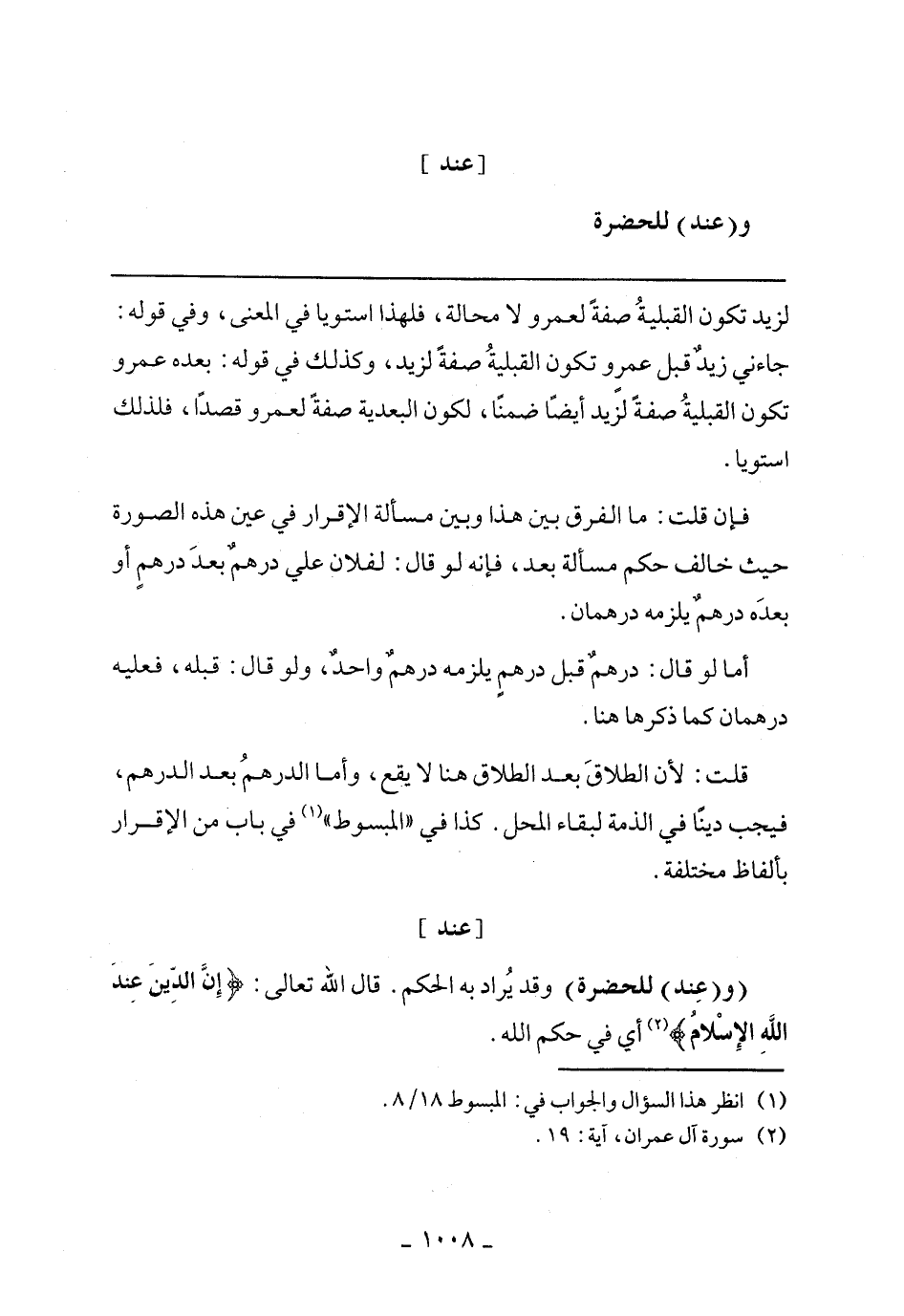 (و (عند) للحضرة) وقد يراد به الحكم. قال الله تعالى: {إِنَّ الدِّينَ عِنْدَ اللَّهِ الْإِسْلَامُ} أي في حكم الله.