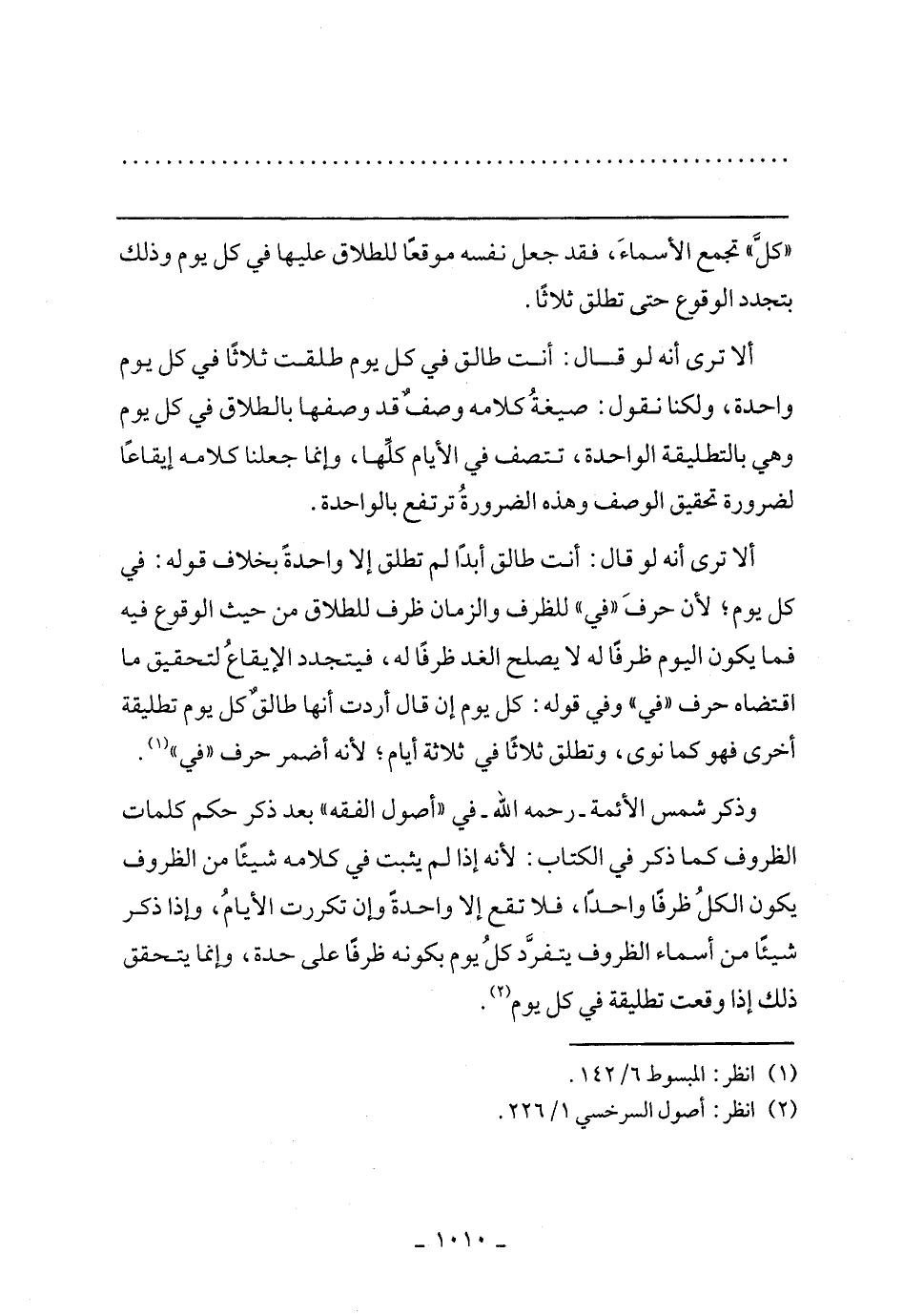 وذكر شمس الأئمة- رحمه الله- في "أصول الفقه" بعد ذكر حكم كلمات الظروف كما ذكر في الكتاب: لأنه إذا لم يثبت في كلامه شيئًا من الظروف يكون الكل ظرفًا واحدًا، فلا تقع إلا واحدة وإن تكررت الأيام، وإذا ذكر شيئًا من أسماء الظروف يتفرد كل يوم بكونه ظرفًا على حدة، وإنما يتحقق ذلك إذا وقعت تطليقة في كل يوم.
