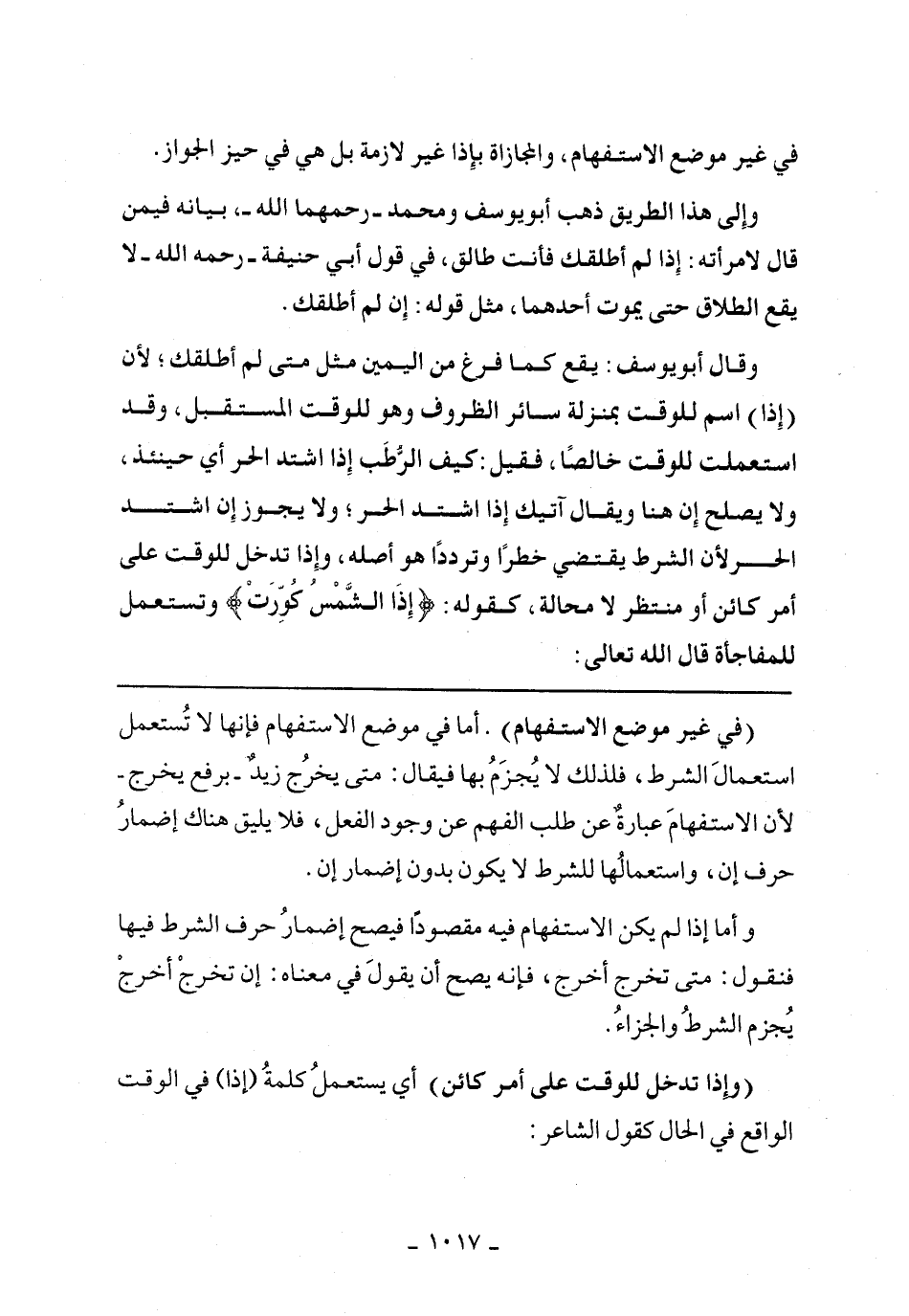 (في غير موضع الاستفهام). أما في موضع الاستفهام فإنها لا تستعمل استعمال الشرط، فلذلك لا يجزم بها فيقال: متى يخرج زيد- برفع يخرج- لأن الاستفهام عبارة عن طلب الفهم عن وجود الفعل، فلا يليق هناك إضمار حرف إن، واستعمالها للشرط لا يكون بدون إضمار إن.