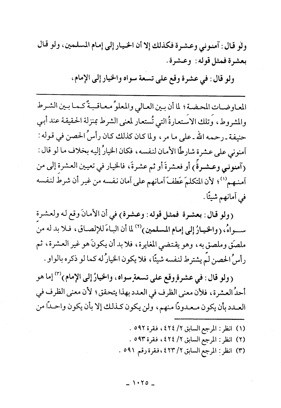 المعاوضات المحضة؛ لما أن بين العالي والمعلو معاقبة كما بين الشرط والمشروط، وتلك الاستعارة التي تستعار لمعنى الشرط بمنزلة الحقيقة عند أبي حنيفة- رحمه الله- على ما مر، ولما كان كذلك كان رأس الحصن في قوله: آمنوني على عشرة شارطًا الأمان لنفسه، فكان الخيار إليه بخلاف ما لو قال: (آمنوني وعشرة) أو فعشرة أو ثم عشرة، فالخيار في تعيين العشرة إلى من آمنهم؛ لأن المتكلم عطف آمانهم على آمان نفسه من غير أن شرط لنفسه في آمانهم شيئًا.