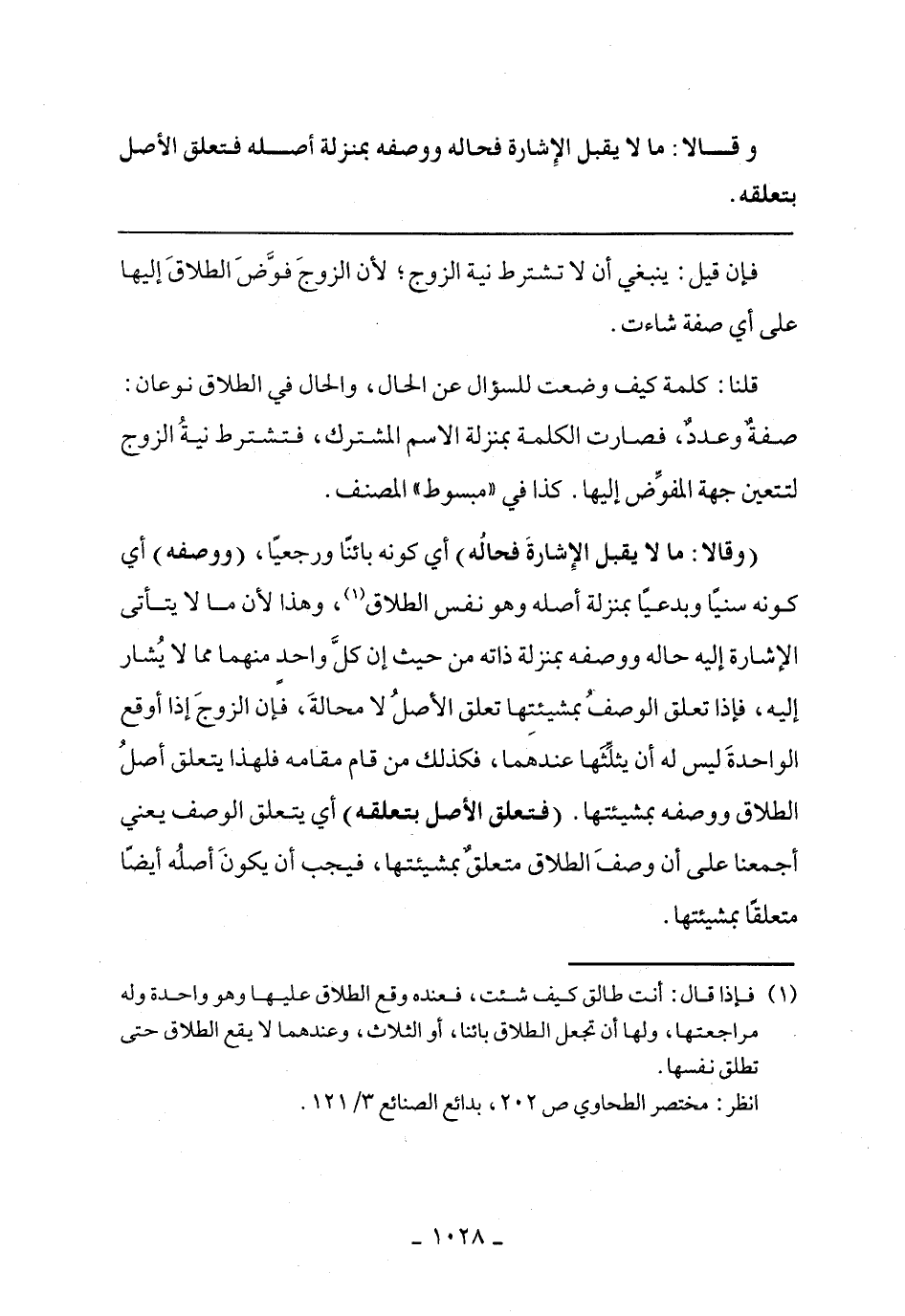 (وقالا: ما لا يقبل الإشارة فحاله) أي كونه بائنًا ورجعيًا، (ووصفه) أي كونه سنيًا وبدعيًا بمنزلة أصله وهو نفس الطلاق، وهذا لأن ما لا يتأتى الإشارة إليه حاله ووصفه بمنزلة ذاته من حيث إن كل واحد منهما مما لا يشار إليه، فإذا تعلق الوصف بمشيئتها تعلق الأصل لا محالة، فإن الزوج إذا أوقع الواحدة ليس له أن يثلثها عندهما، فكذلك من قام مقامه فلهذا يتعلق أصل الطلاق ووصفه بمشيئتها. (فتعلق الأصل بتعلقه) أي يتعلق الوصف يعني أجمعنا على أن وصف الطلاق متعلق بمشيئتها، فيجب أن يكون أصله أيضًا متعلقًا بمشيئتها.