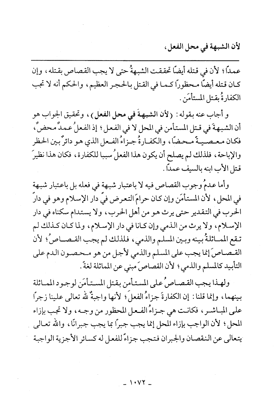 وأجاب عنه بقوله: (لأن الشبهة في محل الفعل)، وتحقيق الجواب هو أن الشبهة في قتل المستأمن في المحل لا في الفعل؛ إذ الفعل عمد محض، فكان معصية محضًا، والكفارة جزاء الفعل الذي هو دائر بين الحظر والإباحة، فلذلك لم يصلح أن يكون هذا الفعل سببًا للكفارة، فكان هذا نظير قتل الأب ابنه بالسيف عمدًا.