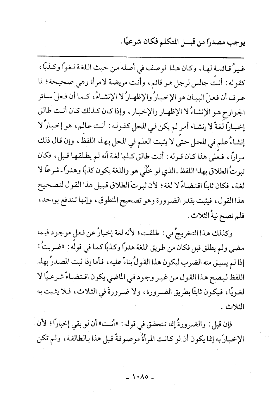 وكذلك هذا التخريج في: طلقت؛ لأنه لغة إخبار عن فعل موجود فيما مضى ولم يطلق قبل فكان من طريق اللغة هدرًا وكذبًا كما في قوله: "ضربت" إذا لم يسبق منه الضرب ليكون هذا القول بناء عليه، فأما إذا ثبت المصدر بهذا اللفظ ليصح هذا القول من غير وجود في الماضي يكون اقتضاء شرعيًا لا لغويًا، فيكون ثابتًا بطريق الضرورة، ولا ضرورة في الثلاث، فلا يثبت به الثلاث.