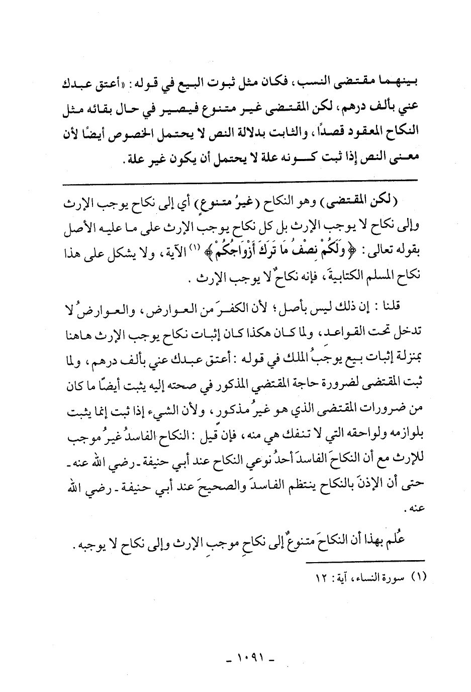 قلنا: إن ذلك ليس بأصل؛ لأن الكفر من العوارض، والعوارض لا تدخل تحت القواعد، ولما كان هكذا كان إثبات نكاح يوجب الإرث هاهنا بمنزلة إثبات بيع يوجب الملك في قوله: أعتق عبدك عني بألف درهم، ولما ثبت المقتضى لضرورة حاجة المقتضي المذكور في صحته إليه يثبت أيضًا ما كان من ضرورات المقتضى الذي هو غير مذكور، ولأن الشيء إذا ثبت إنما يثبت بلوازمه ولواحقه التي لا تنفك هي منه، فإن قيل: النكاح الفاسد غير موجب للإرث مع أن النكاح الفاسد أحد نوعي النكاح عند أبي حنيفة- رضي الله عنه- حتى أن الإذن بالنكاح ينتظم الفاسد والصحيح عند أبي حنيفة- رضي الله عنه.