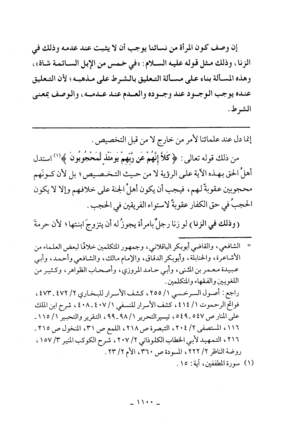من ذلك قوله تعالى: {كَلَّا إِنَّهُمْ عَنْ رَبِّهِمْ يَوْمَئِذٍ لَمَحْجُوبُونَ} استدل أهل الحق بهذه الآية على الرؤية لا من حيث التخصيص؛ بل لأنهم كونهم محجوبين عقوبة لهم، فيجب أن يكون أهل الجنة على خلافهم وإلا لا يكون الحجب في حق الكفار عقوبة لاستواء الفريقين في الحجب.