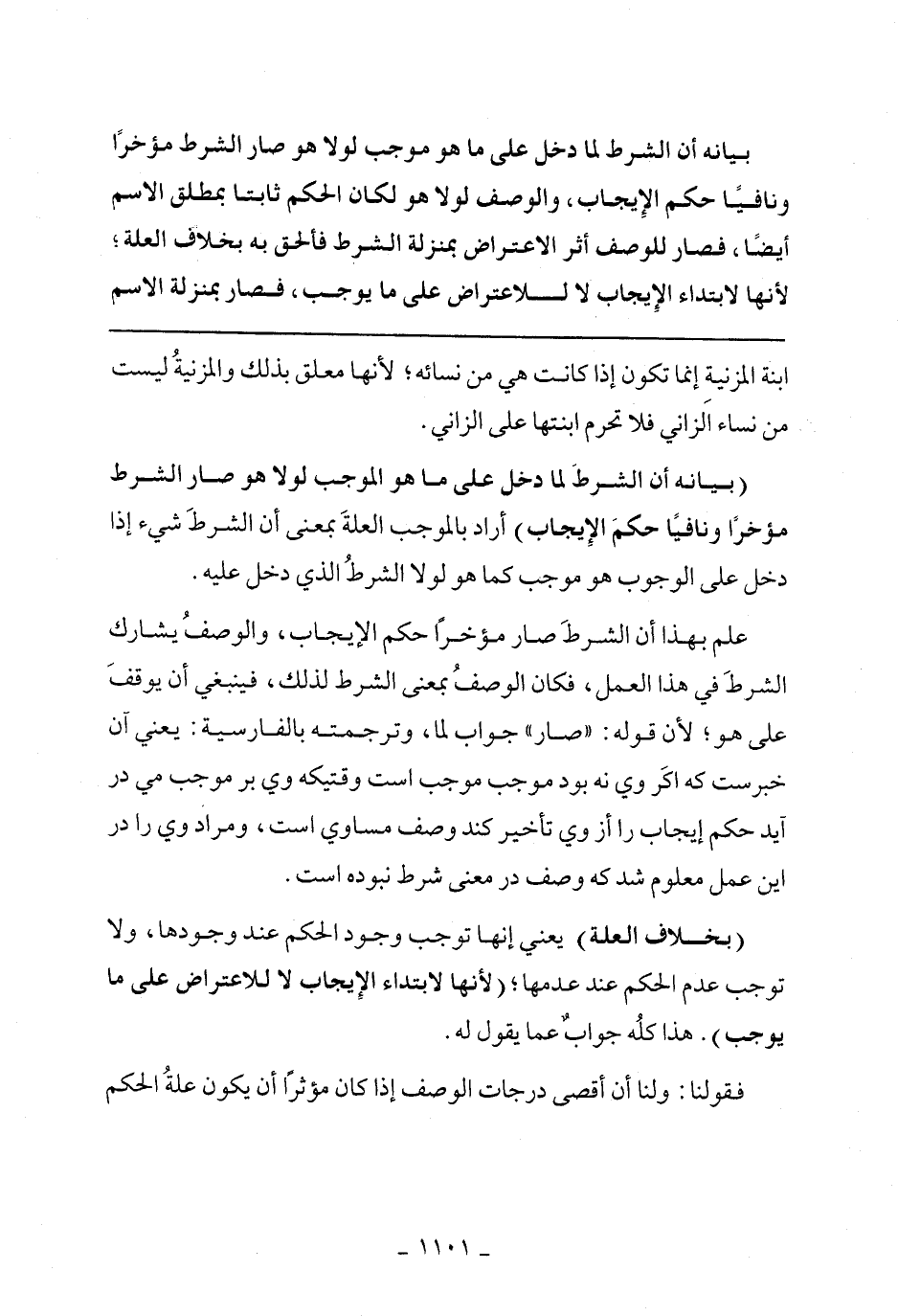 علم بهذا أن الشرط صار مؤخرًا حكم الإيجاب، والوصف يشارك الشرط في هذا العمل، فكان الوصف بمعنى الشرط لذلك، فينبغي أن يوقف على هو؛ لأن قوله: ((صار)) جواب لما، وترجمته بالفارسية: يعني آن خبرست كه اكر وي نه بود موجب موجب است وقتيكه وي بر موجب مي در آيد حكم إيجاب را أز وي تأخبر كند وصف مساوي است، ومراد وي را در اين عمل معمول شد كه وصف در معنى شرط نبوده است.