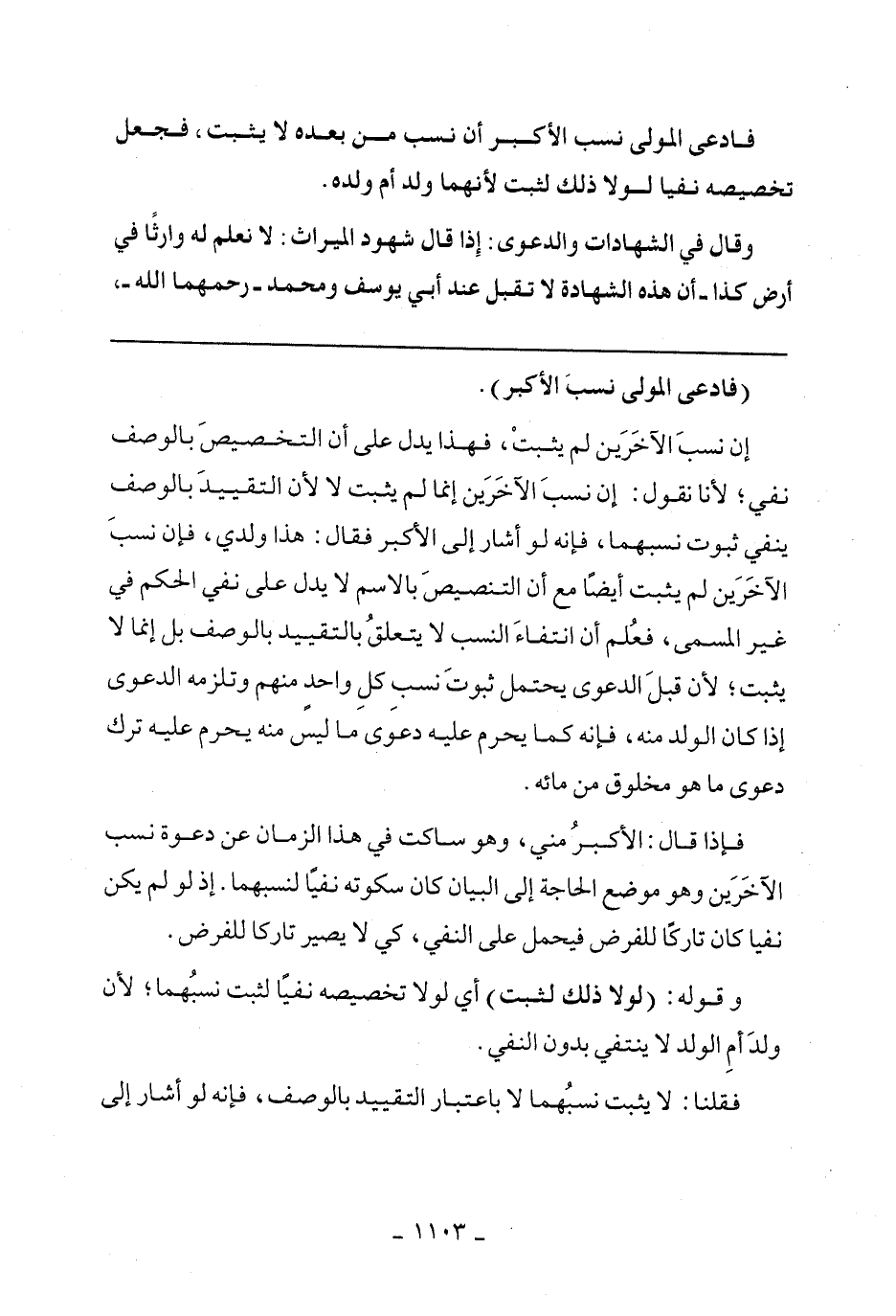 إن نسب الآخرين لم يثبت، فهذا يدل على أن التخصيص بالوصف نفي؛ لأنا نقول: إن نسب الآخرين إنما يثبت لا لأن التقييد بالوصف ينفي ثبوت نسبهما، فإنه لو أشار إلى الأكبر فقال: هذا ولدي، فإن نسب الآخرين لم يثبت أيضًا مع أن التنصيص بالاسم لا يدل على نفي الحكم في غير المسمى، فعلم أن انتفاء النسب لا يتعلق بالتقييد بالوصف بل إنما لا يثبت؛ لأن قل الدعوى يحتمل ثبوت نسب كل واحد منهم وتلزمه الدعوى إذا كان الولد منه، فإنه كما يجرم عليه دعوى ما ليس منه يحرم عليه ترك دعوى ما هو مخلوق من مائة.