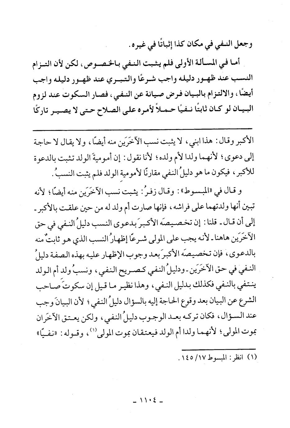 وقال في ((المبسوط)): وقال زفر: يثبت الآخرين منه أيضًا؛ لأنه تبين أنها ولدتهما على فراشه، فإنها صارت أم ولد له من حين علقت بالأكبر- إلى أن قال- قلنا: إن تخصيصه الأكبر بدعوى النسب دليل النفي في حق الآخرين هاهنا- لأنه يجب على المولى شرعًا إظهار النسب الذي هو ثابت منه بالدعوى، فإن تخصيصه الأكبر بعد وجوب الإظهار عليه بهذه الصفة دليل النفي في حق الآخرين- ودليل النفي كصريح النفي، ونسب ولد أم الولد ينتفي بالنفي فكذلك بدليل النفي، وهذا نظير ما قيل إن سكوت صاحب الشرع عن البيان بعد وقوع الحاجة إليه بالسؤال دليل النفي؛ لأن البيان وجب عند السؤال، فكان تركه بعد الوجوب دليل النفي، ولكن يعتق الآخران بموت المولى؛ لأنهما ولدا أم الولد فيعتقان بموت المولى، وقوله: ((نفيًا))