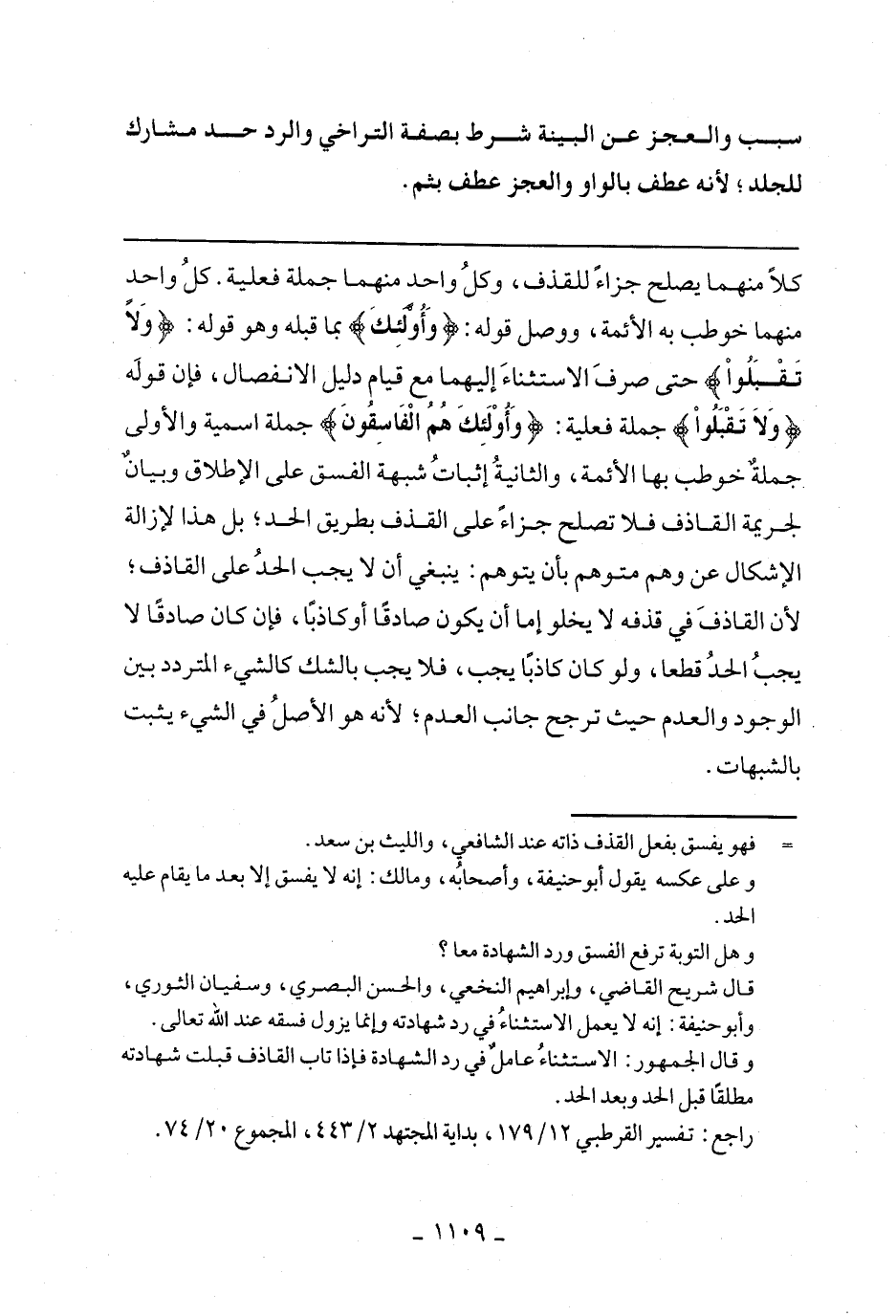 كلًا منهما يصلح جزاء للقذف، وكل واحد منهما جملة فعلية. كل واحد منهما خوطب به الأئمة، ووصل قوله: {وَأُوْلَئِكَ} بما قبله وهو قوله: {وَلا تَقْبَلُوا} جملة فعلية: {وَأُوْلَئِكَ هُمُ الْفَاسِقُونَ} جملة اسمية والأولى جملة خوطب بها الأئمة، والثانية إثبات شبهة الفسق على الإطلاق وبيان لجريمة القاذف فلا تصلح جزاء على القذف بطريق الحد؛ بل هذا لإزالة الإشكال عن وهم متوهم بأن يتوهم: ينبغي أن لا يجب الحد على القاذف؛ لأن القاذف في قذفه لا يخلو إما أن يكون صادقًا أو كاذبًا، فإن كان صادقًا لا يجب الحد قطعًا، ولو كان كاذبًا يحب، فلا يجب بالشك كالشيء المتردد بين الوجود والعدم حيث ترجع جانب العدم؛ لأنه هو الأصل في الشيء يثبت بالشبهات.