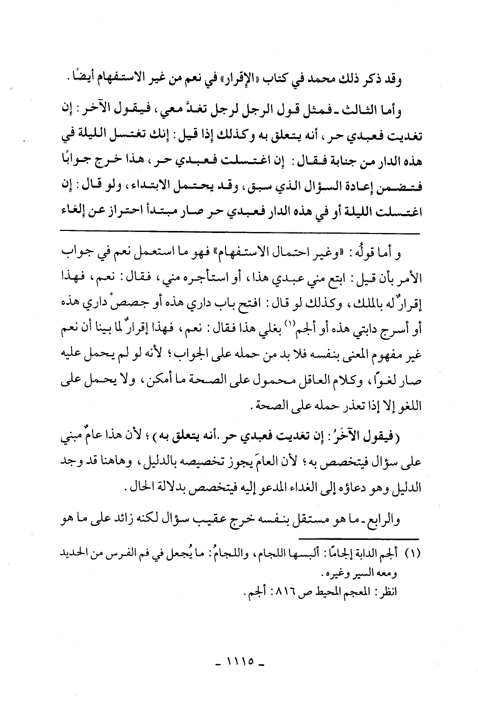 وأما قوله: ((وغير احتمال الاستفهام)) فهو ما استعمل نعم في جواب الأمر بأن قيل: ابت مني عبدي هذا، أو استأجره مني، فقال: نعم، فهذا إقرار له بالملك، وكذلك لو قال: افتح باب داري هذه أو جصص داري هذه أو أسرج دابتي هذه أو ألجم بغلي هذا فقال: نعم، فهذا إقرار لما بينا أن نعم غير مفهوم المعنى بنفسه فلا بد من حمله على الجواب؛ لأنه لو لم يحمل عليه صار لغوًا، وكلام العاقل محمول على الصحة ما أمكن، ولا يحمل على اللغو إلا إذا تعذر حمله على الصحة.