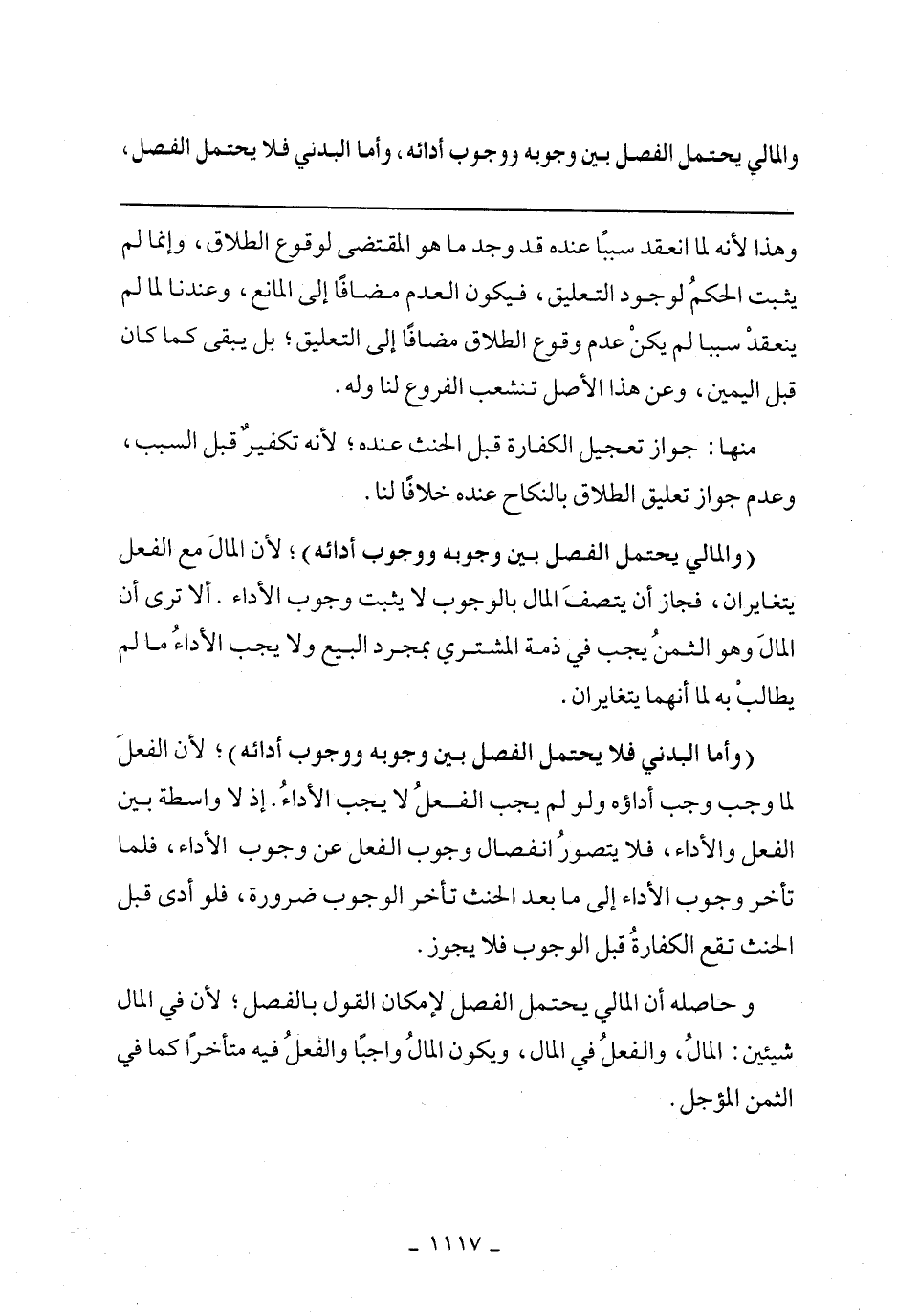 وحاصله أنا لمالي يحتمل الفصل لإمكان القول بالفصل؛ لأن في المال شيئين: المال، والفعل في المال، ويكون المال واجبًا الفعل فيه متأخرًا كما في الثمن المؤجل.