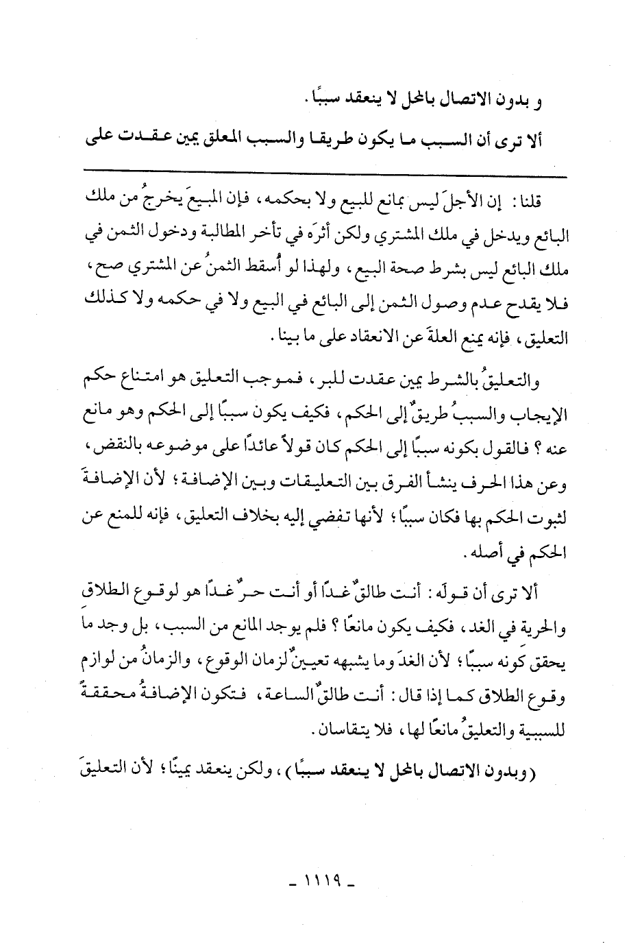 والتعليق بالشرط يمين عقدت للبر، فموجب التعليق هو امتناع حكم الإيجاب والسبب طريق إلى الحكم، فكيف يكون سببًا إلى الحكم وهو مانع عنه؟ فالقول بكونه سببًا إلى الحكم كان قولًا عائدًا على موضوعه بالنقض، وعن هذا الحرف ينشأ الفرق بين التعليقات وبين الإضافة؛ لأن الإضافة لثبوت الحكم بها فكان سببًا؛ لأنها تفضي إليه بخلاف التعليق، فإنه للمنع عن الحكم في أصله.