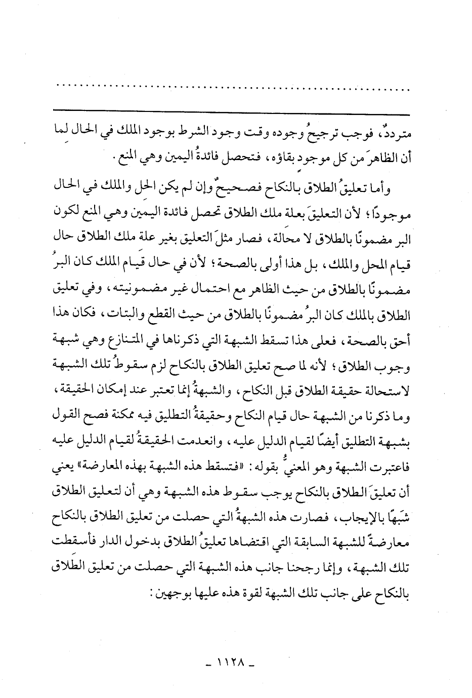 وأما تعليق الطلاق بالنكاح فصحيح وإن لم يكن الحل والملك في الحال موجودًا؛ لانا لتعليق بعلة ملك الطلاق تحصل فائدة اليمين وهي المنع لكون البر مضمونًا بالطلاق لا محالة، فصار مثل التعليق بغير علة ملك الطلاق حال قيام المحل والملك، بل هذا أولى بالصحة؛ لأن في حال قيام الملك كان البر مضمونًا بالطلاق من حيث الظاهر مع احتمال غير مضمونيته، وفي تعليق الطلاق بالملك كان البر مضمونًا بالطلاق من حيث القطع والبتات، فكان هذا أحق بالصحة، فعلى خذا تسقط الشبهة التي ذكرناها في المتنازع وهي شبهة وجوب الطلاق؛ لأنه لما صح تعليق الطلاق بالنكاح لزم سقوط تلك الشبهة لاستحالة حقيقة الطلاق قبل النكاح، والشبهة إنما تعتبر عند إمكان الحقيقة، وما ذكرنا من الشبهة حال قيام النكاح وحقيقة التطليق فيه ممكنة فصح القول بشبهة التطليق أيضًا لقيام الدليل عليه، وانعدمت الحقيقة لقيام الدليل عليه فاعتبرت الشبهة وهو المعنى بقله: ((فتسقط هذه الشبهة بهذه المعارضة)) يعني أن تعليق الطلاق بالنكاح يوجب سقوط هذه الشبهة وهي أن لتعليق الطلاق شبهًا بالإيجاب، فصارت هذه الشبهة التي حصلت من تعليق الطلاق بالنكاح معارضة للشبهة السابقة التي اقتضاها تعليق الطلاق بدخول الدار فأسقطت تلك الشبهة، وإنما رجحنا جانب هذه الشبهة التي حصلت من تعليق الطلاق بالنكاح على جانب تلك الشبهة لقوة هذه عليها بوجهين: