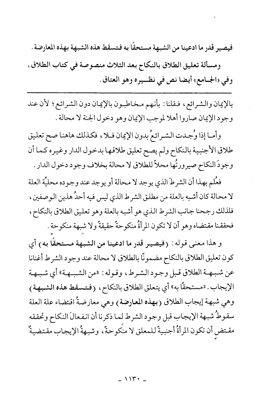 فعلم بهذا أن الشرط الذي يوجد لا محالة أو يوجد عند وجوده محلية العلة لا محالة كان أشبه بالعلة من مطلق الشرط الذي ليس فيه أحد هذين الوصفتين، فلذلك رجحنا جانب الشرط الذي هو أشبه بالعلة وهو تعليق الطلاق بالنكاح، فحققنا مقتضاه هو أن لا تكون المرأة منكوحة حقيقة ولا شبهة منكوحة.
