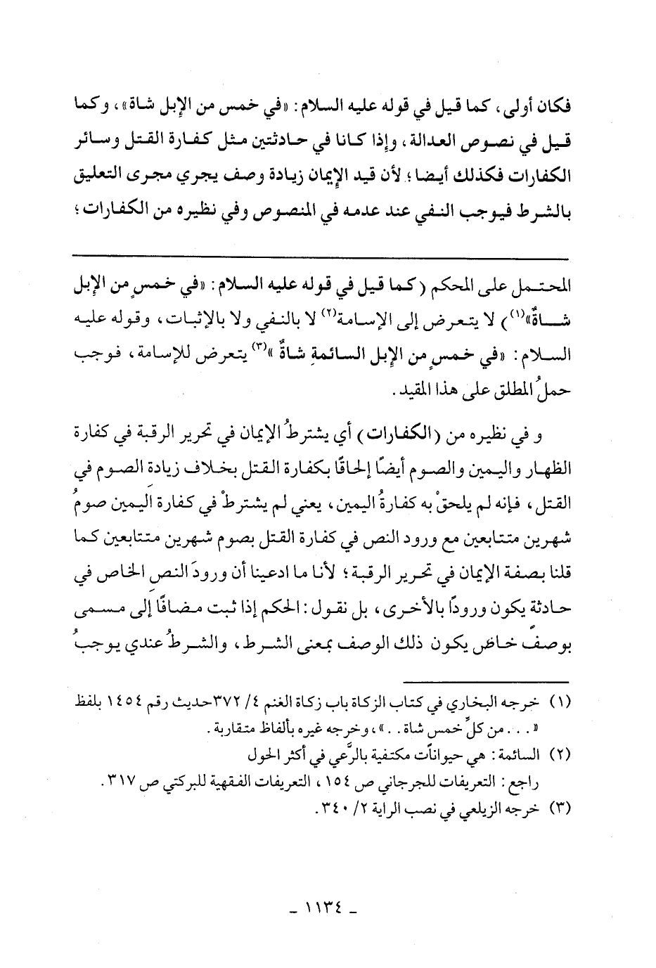 وفي نظيره من (الكفارات) أي يشترك الإيمان في تحرير الرقبة في كفارة الظهار واليمين والصم أيضًا إلحاقًا بكفارة القتل بخلاف زيادة الصوم في القتل، فإنه لم يلحق به كفارة اليمين، يعني لم يشترك في كفارة اليمين صوم شهرين متتابعين مع ورود النص في كفارة القتل بصوم شهرين متتابعين كما قلنا بصفة الإيمان في تحرير الرقبة؛ لانا ما ادعينا أو ورود النص الخاص في حادثة يكون ورودًا بالأخرى، بل نقول: الحكم إذا ثبت مضافًا إلى مسمى بوصف خاص يكون ذلك الوصف بمعنى الشرط، والشرط عندي يوجب