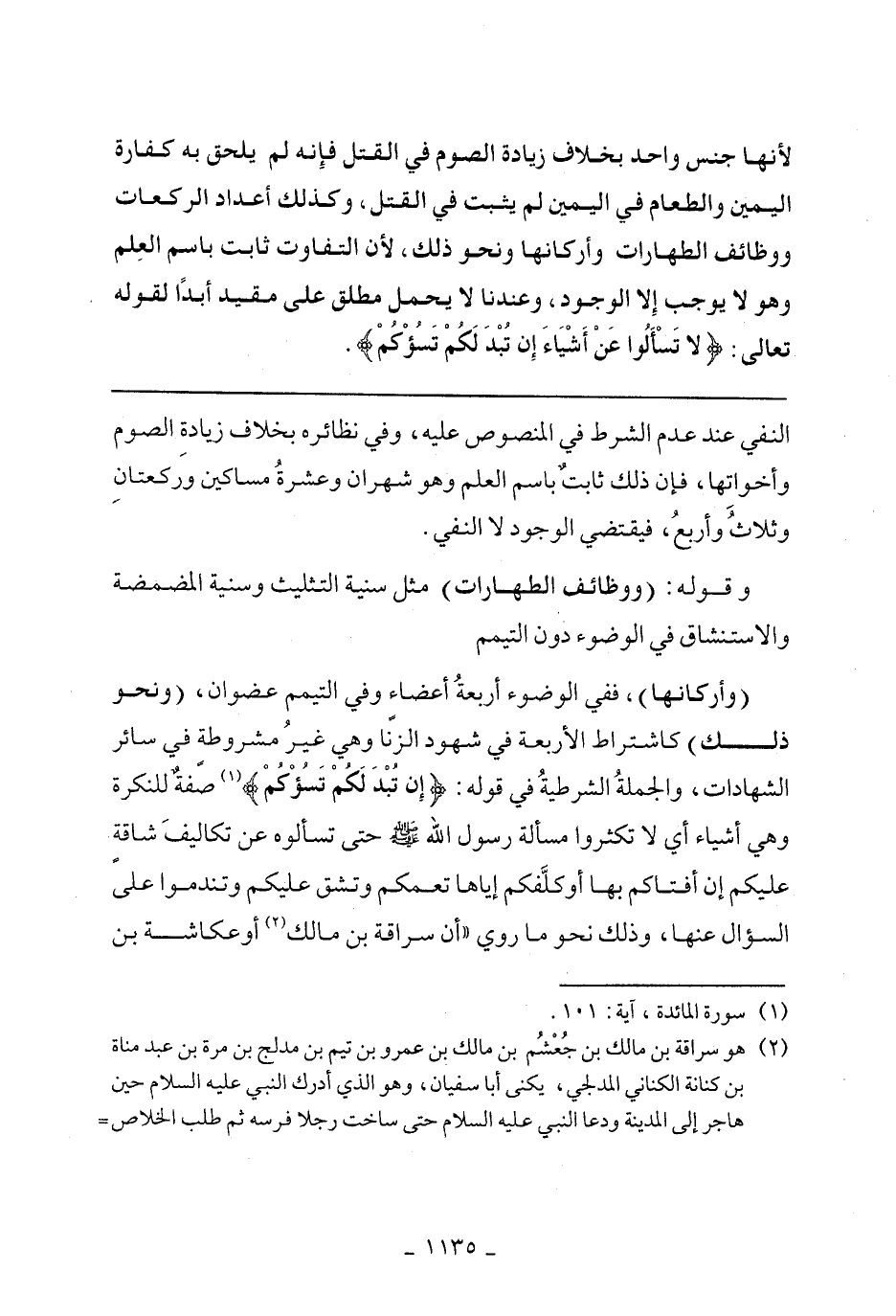 (وأركانها)، ففي الوضوء أربعة أعضاء وفي التميم عضوان، (ونحو ذلك) كاشتراط الأربعة في شهود الزنا وفي غير مشروطة في سائر الشهادات، والجملة الشرطية في قوله: {إِنْ تُبْدَ لَكُمْ تَسُؤْكُمْ} صفة للنكرة وهي أشياء أي لا تكثروا مسألة رسول الله - صلى الله عليه وسلم - حتى تسألوه عن تكاليف شاقة عليكم إن أفتاكم بها أو كلفكم إياها تعمكم وتشق عليكم وتندموا على السؤال عنها، وذلك نحو ما روي ((أن سراقة بن مالك أو عكاشة بن