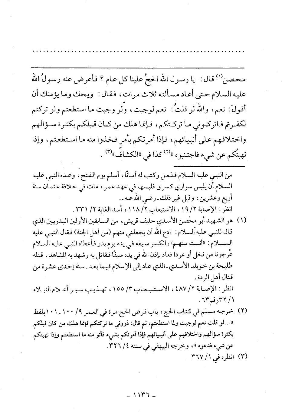 محصن قال: يا رسول الله الحج علينا كل عام؟ فأعرض عنه رسول الله عليه السلام حتى أعاد مسألته ثلاث مرات، فقال: ويحك وما يؤمنك أن أقول: نعم، والله لو قلت: نعم لوجبت، ولو وجبت ما استطعتم ولو تركتم لكفرتم فاتركوني ما تركتم، فإنما هلك من كان قبلكم بكثرة سؤالهم واختلافهم على أنبيائهم، فإذا أمرتكم بأمر فخذوا منه ما استطعتم، وإذا نهيتكم عم شيء فاجتنبوه)) كذا في ((الكشاف)).