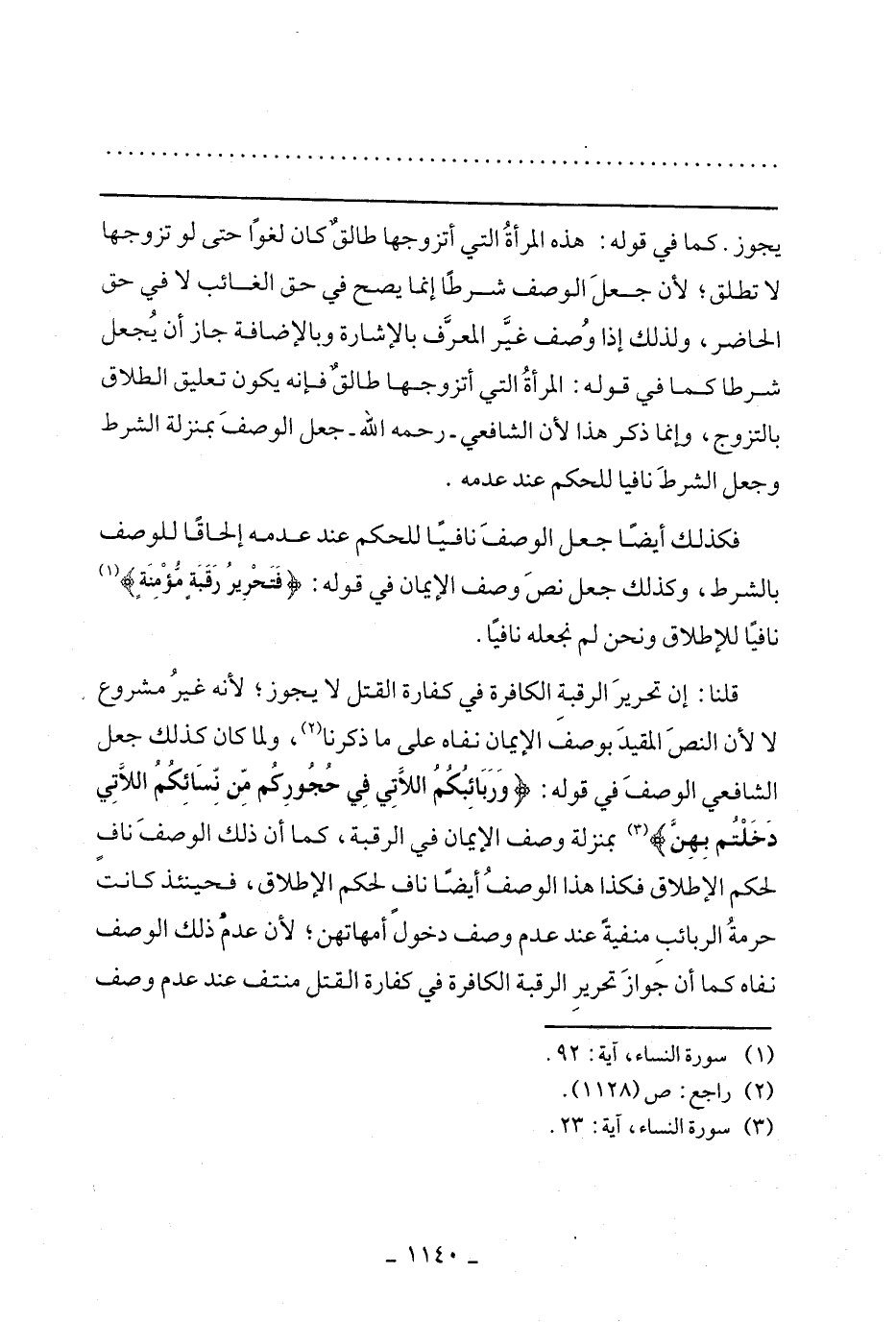 قلنا: إن تحرير الرقبة الكافرة في كفارة القتل لا يجوز؛ لأنه غير مشروع لا لأن النص المقيد بوصف الإيمان نفاه على ما ذكرنا، ولما كان كذلك جهل الشافعي الوصف في قوله: {وَرَبَائِبُكُمُ اللَّاتِي فِي حُجُورِكُمْ مِنْ نِسَائِكُمُ اللَّاتِي دَخَلْتُمْ بِهِنَّ} بمنزلة وصف الإيمان في الرقبة، كما أن ذلك الوصف ناف لحكم الإطلاق فكذا هذا الوصف أيضًا ناف لحكم الإطلاق، فحينئذ كانت حرمة الربائب منفية عند عدم وصف دخول أمهاتهن؛ لأن عدم ذلك الوصف نفاه كما أن جواز تحرير الرقبة الكافرة في كفارة القتل منتف عند عدم وصف