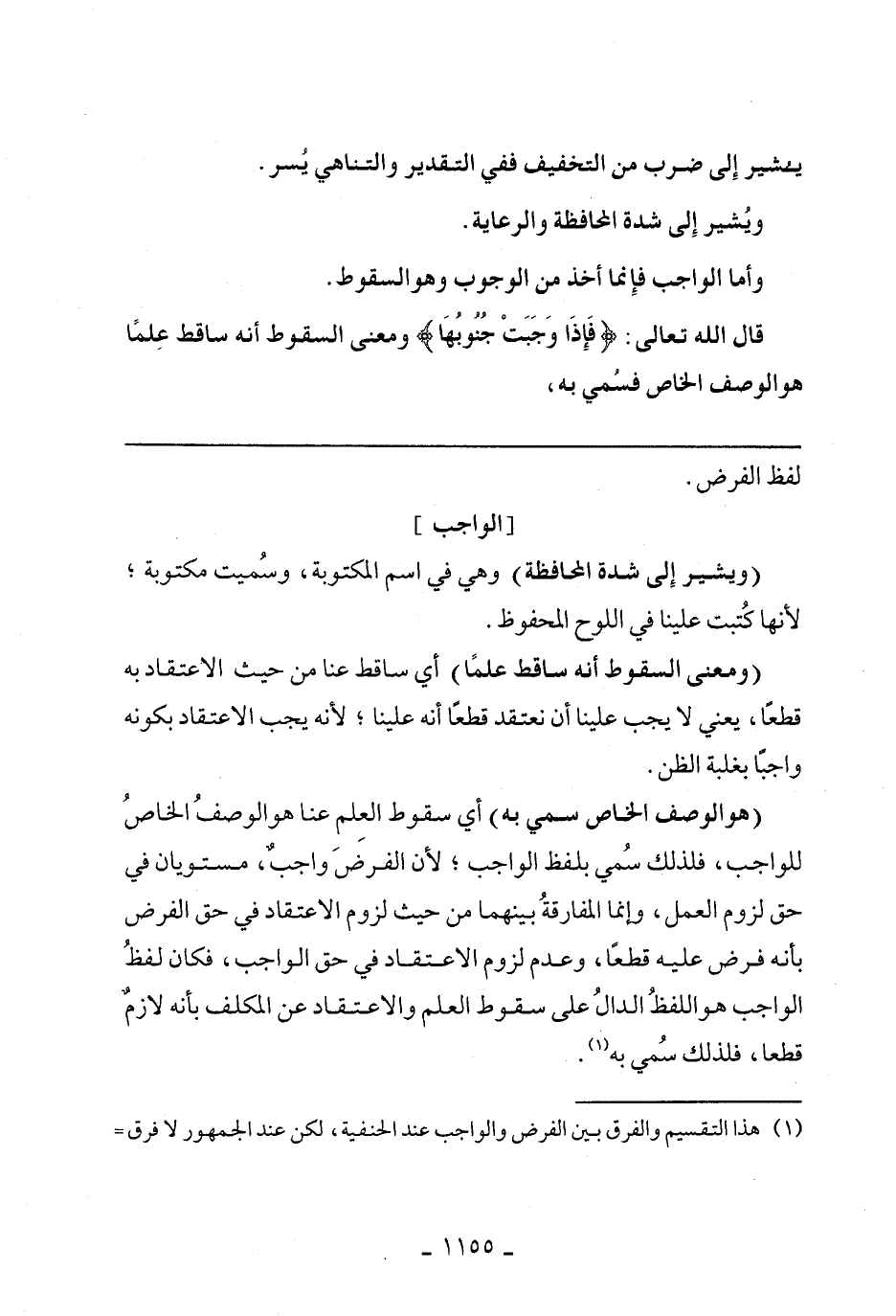(هو الوصف الخاص سمي به) أي سقوط العلم عما هو الوصف الخاص للواجب، فلذلك سمي بلفظ الواجب؛ لأن الفرض واجب، مستويان في حق لزوم العمل، وإنما المفارقة بينهما من حيث لزوم الاعتقاد في حق الفرض بأنه فرض عليه قطعًا، وعدم لزوم الاعتقاد في حق الواجب، فكان لفظ الواجب هو اللفظ الدال على سقوط العلم والاعتقاد عن المكلف لأنه لازم قطعًا، فلذلك سمي به.