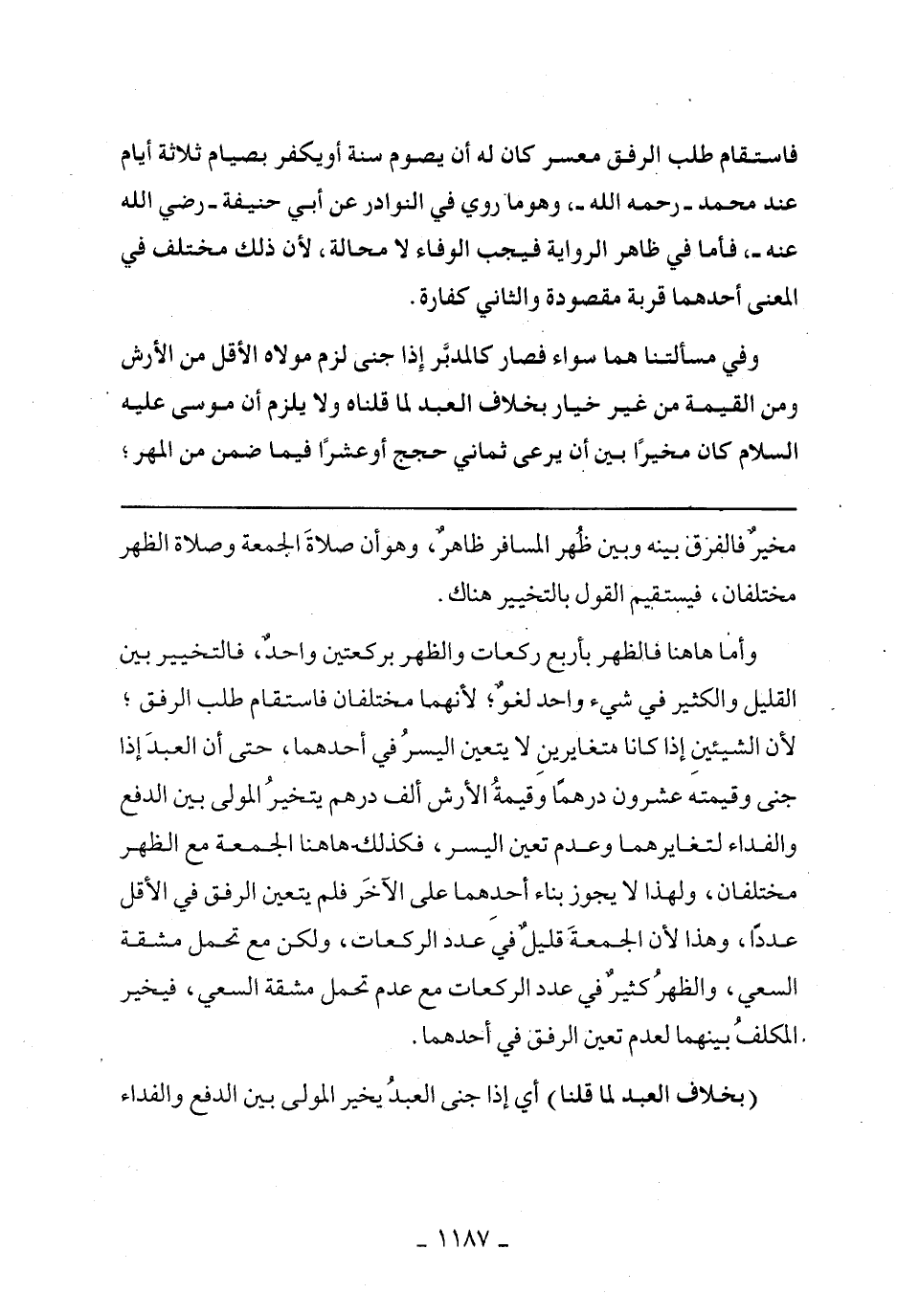 وأما هاهنا فالظهر بأربع ركعات والظهر بركعتين واحد، فالتخيير بين القليل والكثير في شيء واحد لغو؛ لأنهما مختلفان فاستقام طلب الرفق؛ لأن الشيئين إذا كانا متغايرين لا يتعين اليسر في أحدهما، حتى أن العبد إذا جنى وقيمته عشرون درهمًا وقيمة الأرش ألف درهم يتخير المولى بين الدفع والفداء لتغايرهما وعدم تعين اليسر، فكذلك هاهنا الجمعة مع الظهر مختلفان، ولهذا لا يجوز بناء أحدهما على الآخر فلم يتعين الرفق في الأقل عددًا، وهذا لأن الجمعة قليل في عدد الركعات، ولكن مع تحمل مشقة السعي، والظهر كثير في عدد الركعات مع عدم تحمل مشقة السعي، فيخير المكلف بينهما لعدم تعين الرفق في أحدهما.