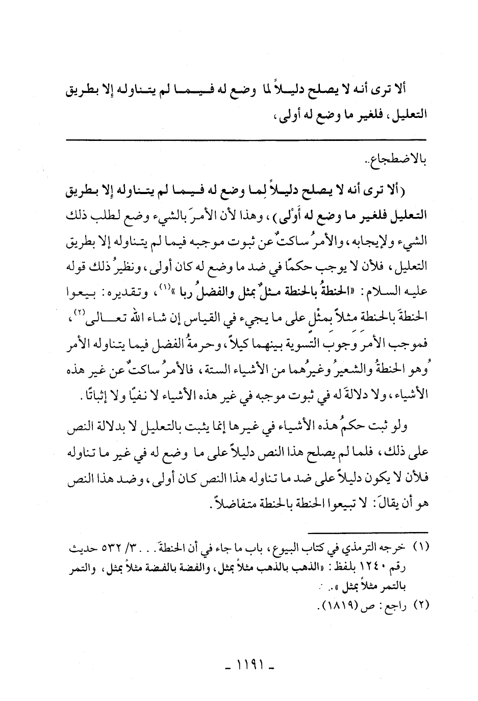 ولو ثبت حكم هذه الأشياء في غيرها إنما يثبت بالتعليل لا بدلالة النص على ذلك، فلما لم يصلح هذا النص دليلًا على ما وضع له في غير ما تناوله فلأن لا يكون دليلًا على ضد ما تناوله هذا النص كان أولى، وضد هذا النص هو أن يقال: لا تبيعوا الحنطة بالحنطة متفاضلًا.