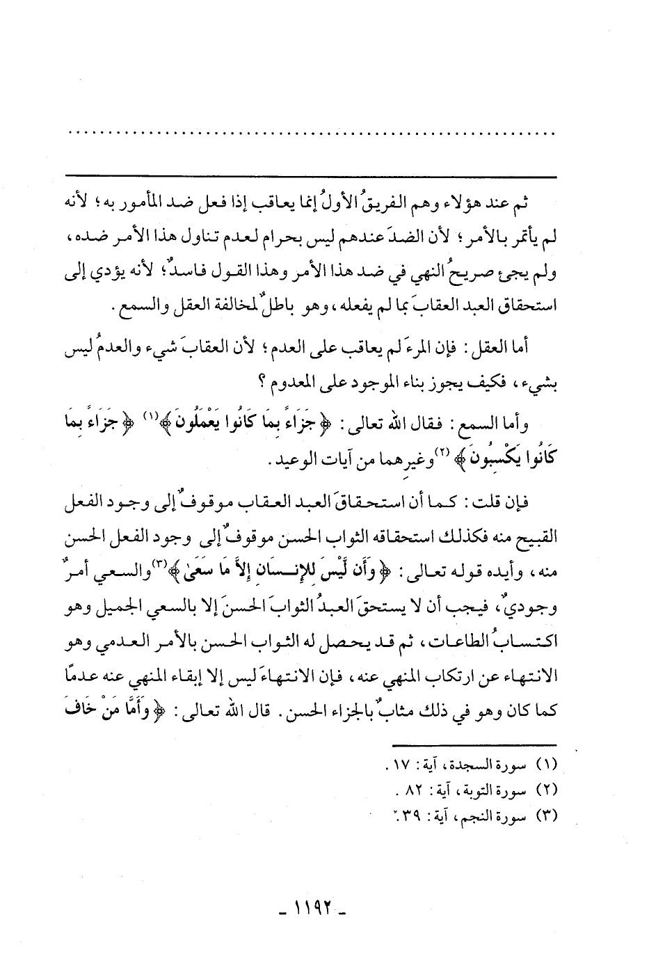وأما السمع: فقال الله تعالى: {جَزَاءً بِمَا كَانُوا يَعْمَلُونَ} {جَزَاءً بِمَا كَانُوا يَكْسِبُونَ} وغيرهما من آيات الوعيد.