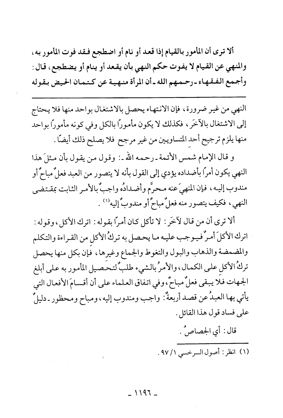 وقال الإمام شمس الأئمة- رحمه الله-: وقول من يقول بأن مثل هذا النهي يكون أمرًا بأضداده يؤدي إلى القول بأن لا يتصور من العبد فعل مباح أو مندوب إليه، فإن المنهي عنه محرم أضداده واجب بالأمر الثابت بمقتضى النهي، فيكون يتصور منه فعل مباح أو مندوب إليه.