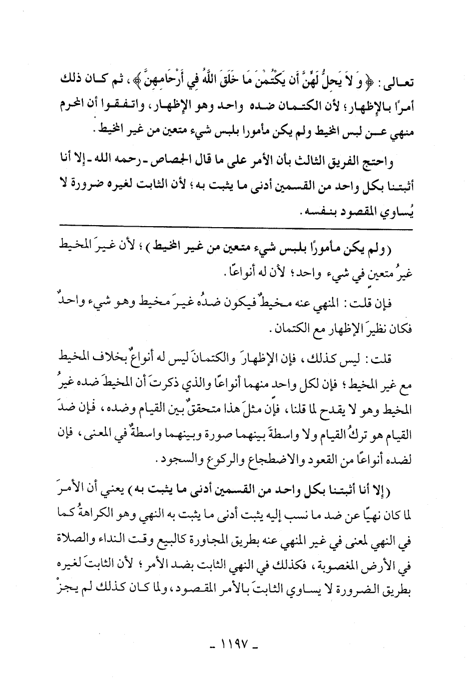 قلت: ليس كذلك، فإن الإظهار والكتمان ليس له أنواع بخلاف المخيط مع غير المخيط؛ فإن لكل واحد منهما أنواعًا والذي ذكرت أن المخيط ضده غير المخيط وهو لا يقدح لما قلنا، فإن مثل هذا متحقق بين القيام وضده، فإن ضد القيام هو ترك القيام ولا واسطة بينهما صورة وبينهما واسطة في المعنى، فإن لضده أنواعًا من القعود والاضطجاع والركوع والسجود.