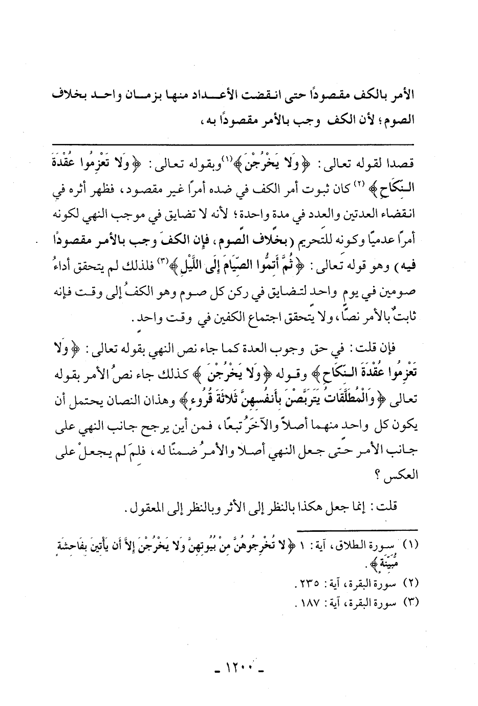فإن قلت: في حق وجوب العدة كما جاء نص النهي بقوله تعالى: {وَلا تَعْزِمُوا عُقْدَةَ النِّكَاحِ} وقوله {وَلا يَخْرُجْنَ} كذلك جاء نص الأمر بقوله تعالى {وَالْمُطَلَّقَاتُ يَتَرَبَّصْنَ بِأَنفُسِهِنَّ ثَلاثَةَ قُرُوءٍ} وهذان النصان يحتمل أن يكون كل واحد منهما أصلًا والآخر تبعًا، فمن أين يرجح جانب النهي على جانب الأمر حتى جعل النهي أصلًا والأمر ضمنًا له، فلم لم يجعل على العكس؟