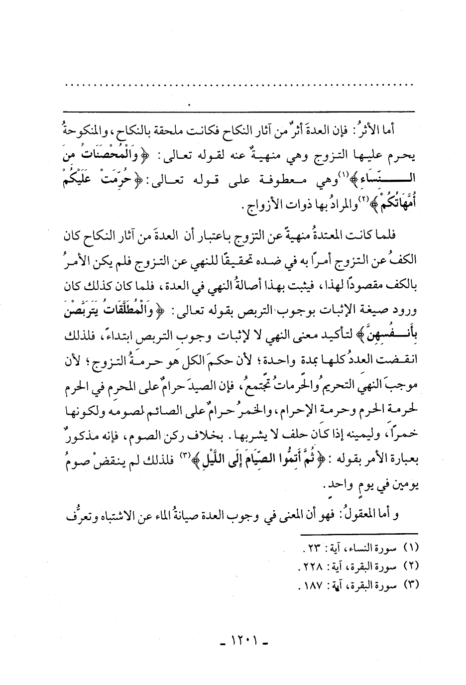 فلما كانت المعتدة منهية عن التزوج باعتبار أن العدة من آثار النكاح كان الكف عن التزوج أمرًا به في ضده تحقيقًا للنهي عن التزوج فلم يكن الأمر بالكف مقصودًا لهذا، فيثبت بهذا أصالة النهي في العدة، فلما كان كذلك كان ورود صيغة الإثبات بوجوب التربص بقوله تعالى: {وَالْمُطَلَّقَاتُ يَتَرَبَّصْنَ بِأَنفُسِهِنَّ} لتأكيد معنى النهي لا لإثبات وجوب التربص ابتداء، فلذلك انقضت العدد كلها بمدة واحدة؛ لأن حكم الكل هو حرمة التزوج؛ لأن موجب النهي التحريم والحرمات تجتمع، فإن الصيد حرام على المحرم في الحرم لحرمة الحرم وحرمة الإحرام، والخمر حرام على الصائم لصومه ولكونها خمرًا، وليمينه إذا كان حلف لا يشربها. بخلاف ركن الصوم، فإنه مذكور بعبارة الأمر بقوله: {ثُمَّ أَتِمُّوا الصِّيَامَ إِلَى اللَّيْلِ} فلذلك لم ينقض صوم يومين في يوم واحد.