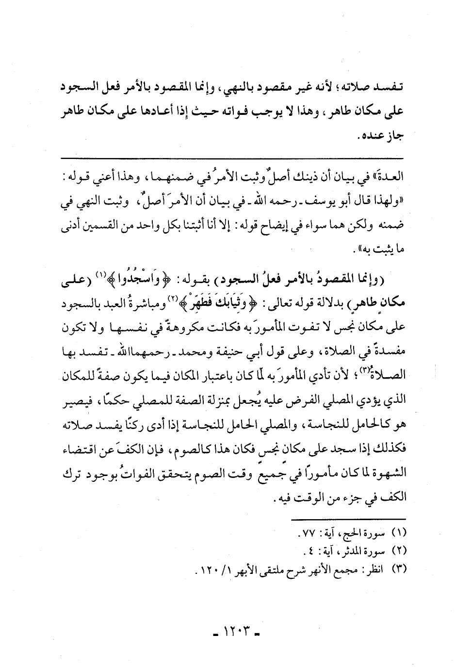(وإنما المقصد بالأمر فعل السجود) بقوله: {وَاسْجُدُوا} (على مكان طاهر) بدلالة قوله تعالى: {وَثِيَابَكَ فَطَهِّرْ} ومباشرة العبد بالسجود على مكان نجس لا تفوت المأمور به فكانت مكروهة في نفسها ولا تكون مفسدة في الصلاة، وعلى قول أبي حنيفة ومحمد- رحمهما الله- تفسد بها الصلاة؛ لأن تأدي المأمور به لما كان باعتبار المكان فيما يكون صفة للمكان الذي يؤدي المصلي الفرض عليه يجعل بمنزلة الصفة للمصلي حكمًا، فيصير هو كالحامل لنجاسة، والمصلي الحامل للنجاسة إذا أدى ركنًا يفسد صلاته فكذلك إذا سجد على مكان نجس فكان هذا كالصوم، فإن الكف عن اقتضاء الشهوة لما كان مأمورًا في جميع وقت الصوم يتحقق الوات بوجود ترك الكف في جزء من الوقت فيه.