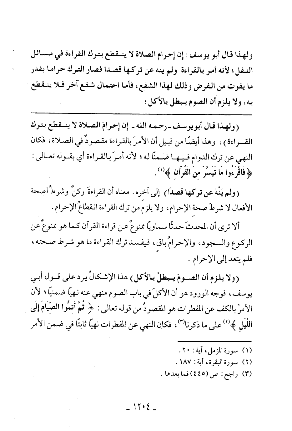 (ولهذا قال أبو يوسف- رحمه الله- إن إحرام الصلاة لا ينقطع بترك القراءة)، وهذا أيضًا من قبيل أن الأمر بالقراءة مقصود في الصلاة، فكان النهي عن ترك الدوام فيها ضمنًا له؛ لأنه أمر بالقراءة أي بقوله تعالى: {فَاقْرَءُوا مَا تَيَسَّرَ مِنَ الْقُرْآنِ}.