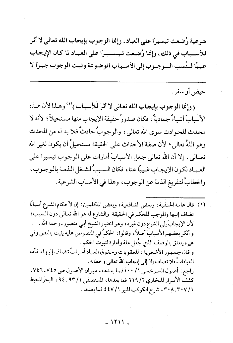 (وإنما الوجوب بإيجاب الله تعالى لا أثر للأسباب) وهذا لأن هذه الأسباب أشياء جمادية، فكان صدور حقيقة الإيجاب منها مستحيلًا؛ لأنه لا محدث للحوادث سوى الله تعالى، والوجوب حادث فلا بد له من المحدث وهو الله تعالى؛ لأن صفة الأحداث على الحقيقة مستحيل أن يكون لغير الله تعالى. إلا أن الله تعالى جعل الأسباب أمارات على الوجوب تيسيرًا على العباد لكون الإيجاب غيبًا عنا، فكانا لسبب لشغل الذمة بالوجوب، والخطاب لتفريغ الذمة عن الوجوب، وهذا في الأسباب الشرعية.