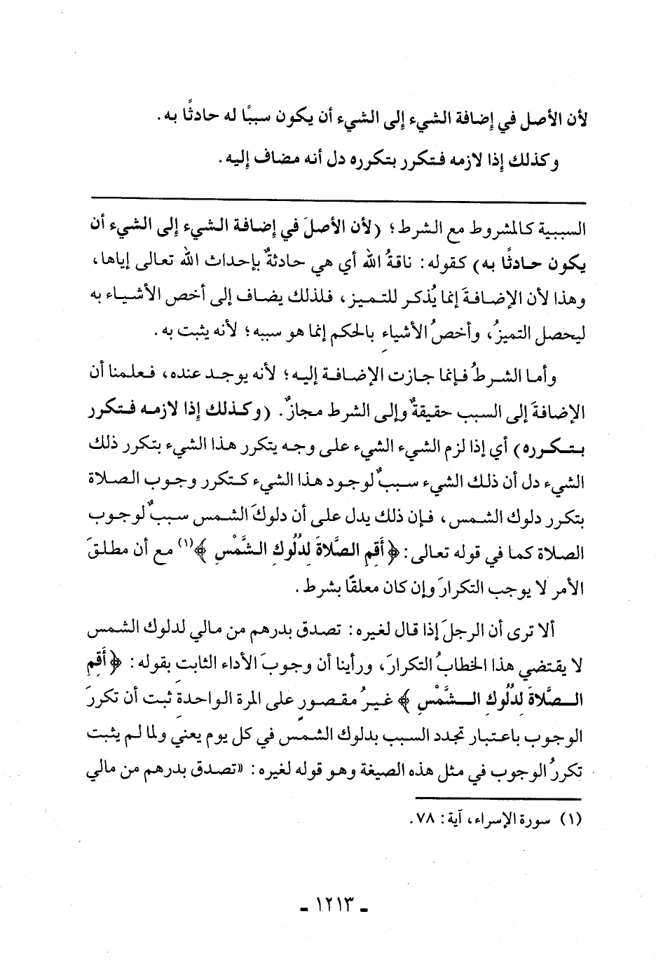 وأما الشرط فإنما جازت الإضافة إليه؛ لأنه يوجد عنده، فعلمنا أن الإضافة إلى السبب حقيقة وإلى الشرط مجاز. (وكذلك إذا لازمه فتكرر بتكرره) إي إذا لزم الشيء الشيء على وجه يتكرر هذا الشيء بتكرر ذلك الشيء دل أن ذلك الشيء سبب لوجود هذا الشيء كتكرر وجوب الصلاة بتكرر دلوك الشمس، فإن ذلك يدل على أن دلوك الشمس سبب لوجوب الصلاة كما في قوله تعالى: {أَقِمِ الصَّلاةَ لِدُلُوكِ الشَّمْسِ} مع أن مطلق الأمر لا يوجب التكرار وإن كان معلقًا بشرط.
