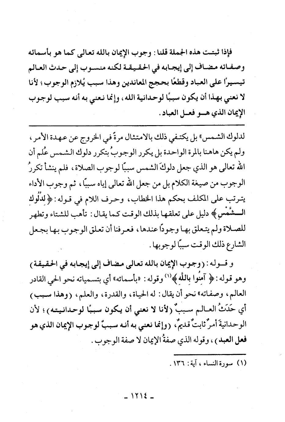 قوله: (وجوب الإيمان بالله تعالى مضاف إلى إيجابه في الحقيقة) وهو قوله: {آمَنُوا بِاللَّهِ} وقوله: ((بأسمائه)) أي بتسمياته نحو الحي القادر العالم، وصفاته نحو أن يقال: له الحياة، والقدرة، والعلم، (وهذا سبب) أي حدث العالم سبب (لأنا لا نعنى أن يكون سببًا لوحدانيته)؛ لأن الوحدانية أمر ثابت قديم، (وإنما نعني به أنه سبب لوجوب الإيمان الذي هو فعل العبد)، وقوله الذي صفة الإيمان لا صفة الوجوب.