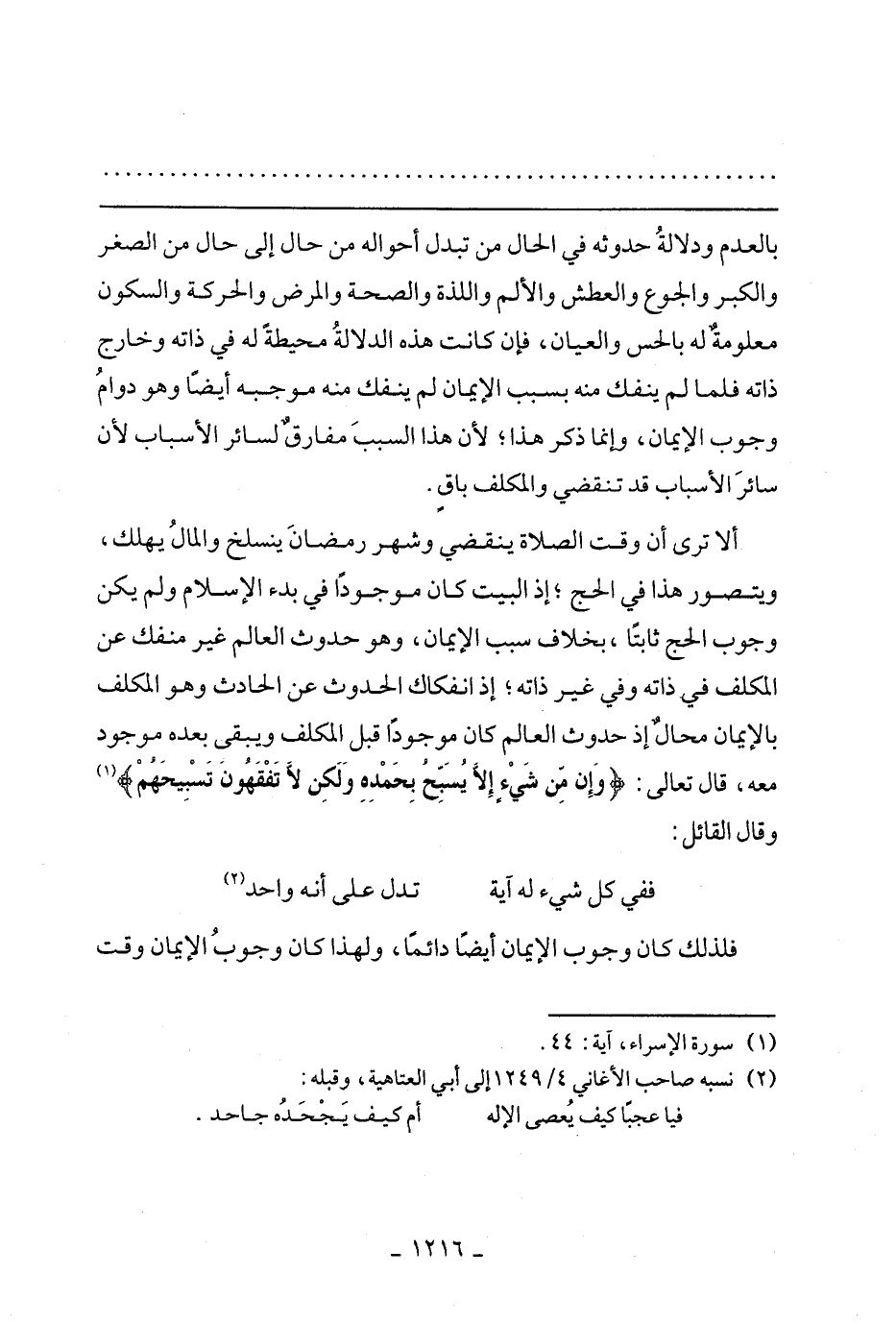 ألا ترى أن وقت الصلاة ينقضي وشهر رمضان ينسلخ والمال يهلك، ويتصور هذا في الحج؛ إذ البيت كان مجودًا في بدء الإسلام ولم يكن وجوب الحج ثابتًا، بخلاف سبب الإيمان، وهو حدوث العالم غير منفك عن المكلف في ذاته وفي غير ذاته؛ إذ انفكاك الحدوث عن الحادث وهو المكل بالإيمان محال إذ حدوث العالم كان موجودًا قبل المكلف ويبقى بعده موجود معه، قال تعالى: {وَإِنْ مِنْ شَيْءٍ إِلَّا يُسَبِّحُ بِحَمْدِهِ وَلَكِنْ لا تَفْقَهُونَ تَسْبِيحَهُمْ} وقال قائل: