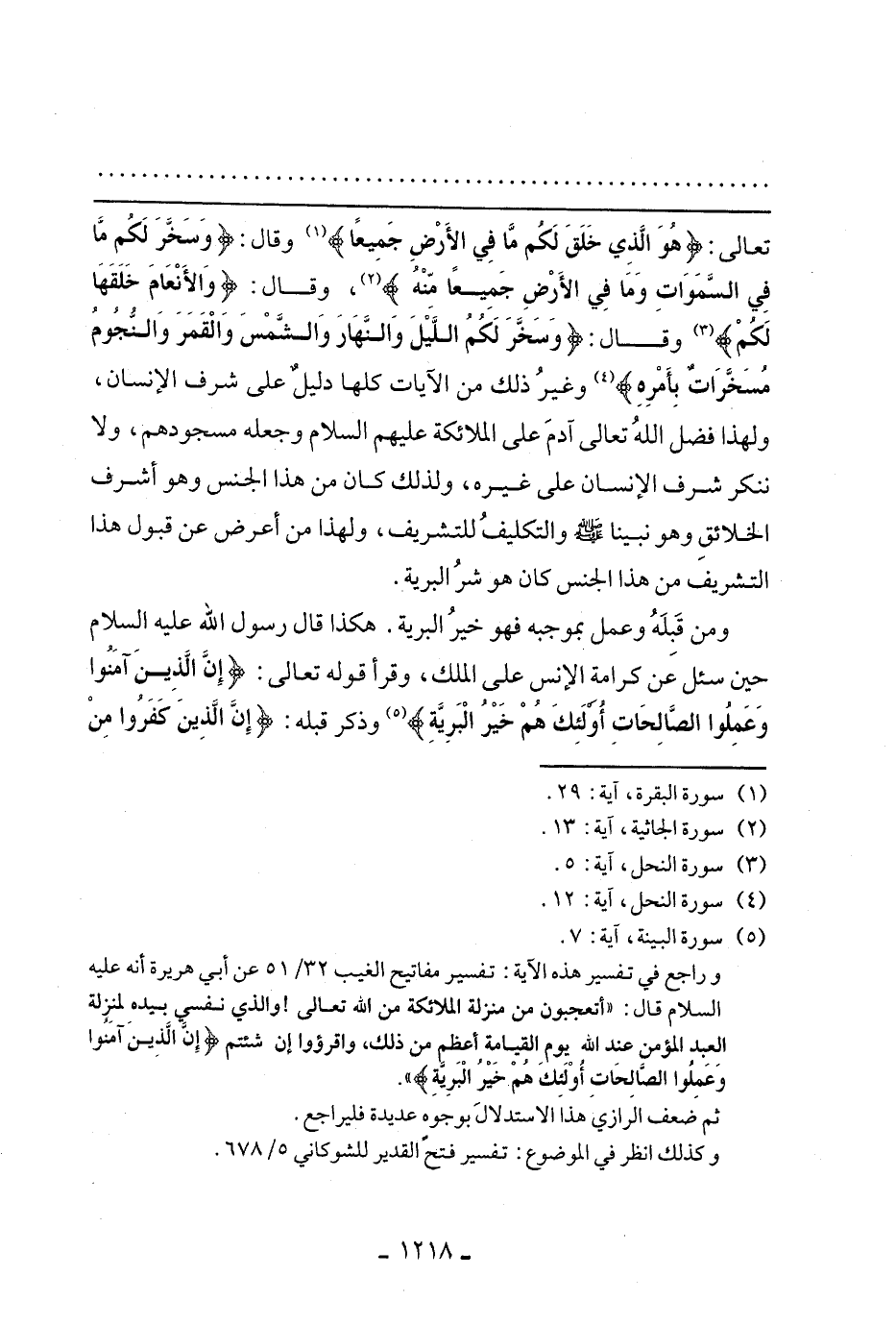 تعالى: {هُوَ الَّذِي خَلَقَ لَكُمْ مَا فِي الأَرْضِ جَمِيعًا} وقال: {وَسَخَّرَ لَكُمْ مَا فِي السَّمَوَاتِ وَمَا فِي الأَرْضِ جَمِيعًا مِنْهُ}، وقال: {وَالأَنْعَامَ خَلَقَهَا لَكُمْ} وقال: {وَسَخَّرَ لَكُمُ اللَّيْلَ وَالنَّهَارَ وَالشَّمْسَ وَالْقَمَرَ وَالنُّجُومُ مُسَخَّرَاتٌ بِأَمْرِهِ} وغير ذلك من الآيات كلها دليل على شرف الإنسان، ولهذا فضل الله تعالى آدم على الملائكة عليهم السلام وجعله مسجودهم، ولا ننكر شرف الإنسان على غيره، ولذلك كان في هذا الجنس وهو أشرف الخلائق وهو نبينا - صلى الله عليه وسلم - والتكليف للتشريف، ولهذا من أعرض عن قبول هذا التشريف من هذا الجنس كان هو شر البرية.