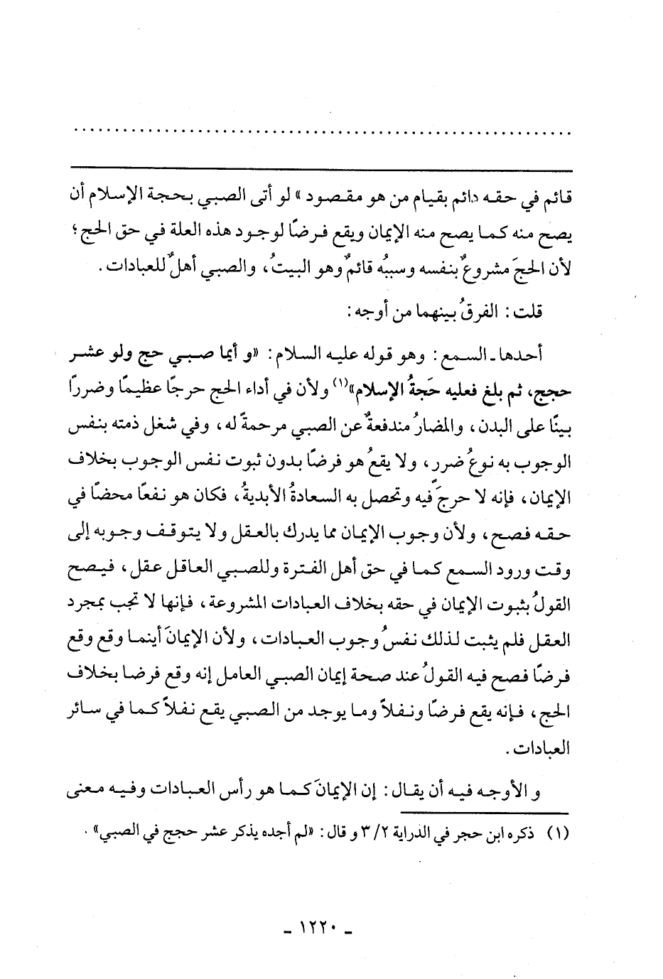 أحدها- السمع: وهو قوله عليه السلام: ((وإيما صبي حج ولو عشر حجج، ثم بلغ فعليه حجة الإسلام)) ولان في أداء الحج حرجًا عظيمًا وضررًا بينًا على البدن، والمضار مندفعة عن الصبي مرحمة له، وفي شغل ذمته بنفس الوجوب به نوع ضرر، ولا يقع هو فرضًا بدون ثبوت نفس الوجوب بخلاف الإيمان، فإنه لا حرج فيه وتحصل به سعادة الأبدية، فكان هو نفعًا محضًا في حقه فصح، ولأن وجوب الإيمان مما يدرك بالعقل ولا يتوقف وجوبه إلى وقت ورود السمع كما في حق أهل الفترة وللصبي العاقل عقل، فيصح القول بثبوت الإيمان في حقه بخلاف العبادات المشروعة، فإنها لا تجب بمجرد العقل فلم يثبت لذلك نفس وجوب العبادات، ولأن الإيمان أينما وقع وقع فرضًا فصح فيه القول عند صحة إيمان الصبي العامل إنه وقع فرضًا بخلاف الحج، فإنه يقع فرضًا ونفلًا وما يوجد من الصبي يقع نفلًا كما في سائر العبادات.