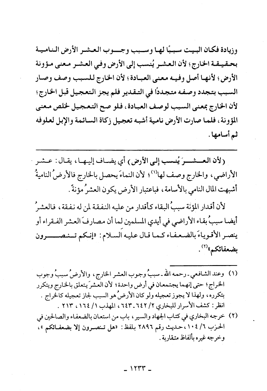 لأن أقدار المؤنة سبب البقاء كأقدار من عليه من عليه النفقة لمن له نفقة، فالعشر أيضًا سبب بقاء الأراضي في أيدي المسلمين لما أن مصارف العشر الفقراء أو ينصر الأقوياء بالضعفاء كما قال عليه السلام: ((إنكم تنصرون بضعفائكم)).