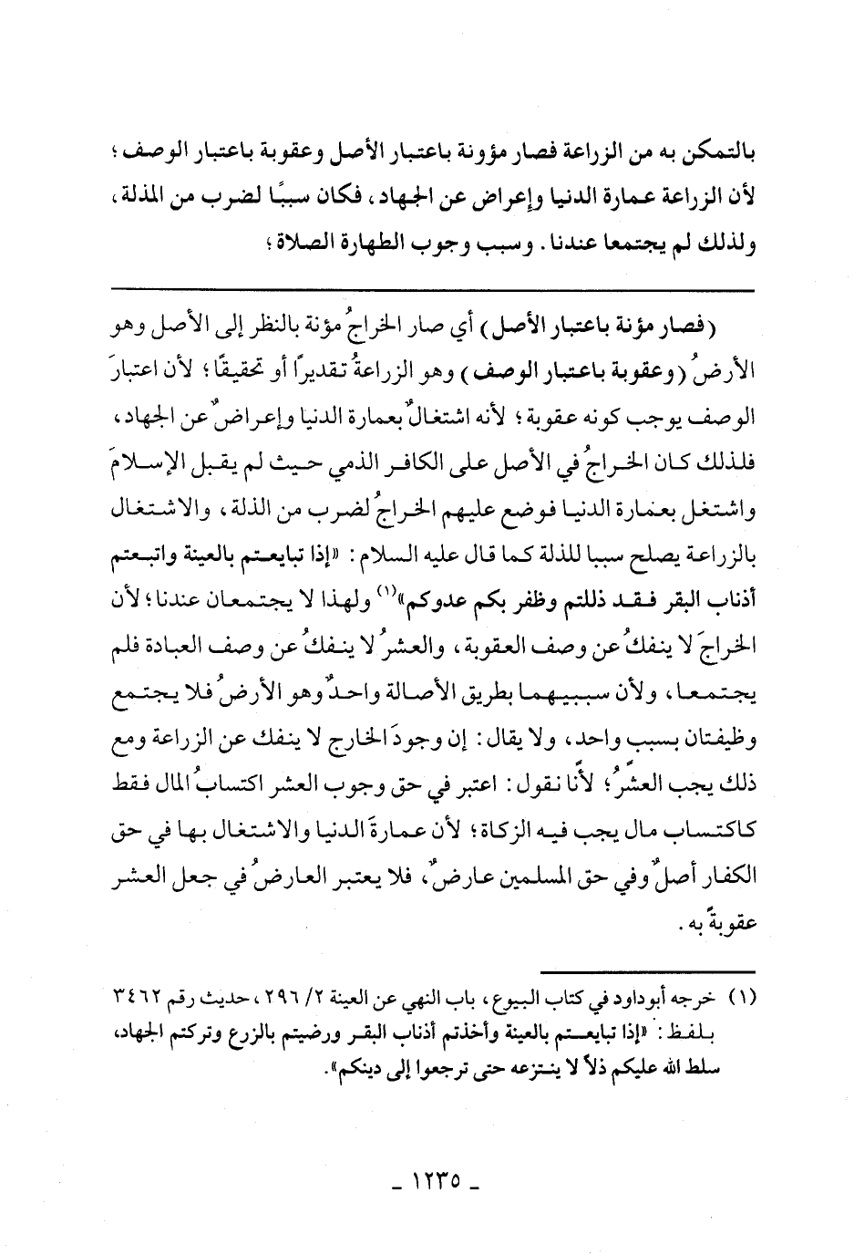 (فصار مؤنة باعتبار الأصل) أي صار الخراج مؤنة بالنظر إلى الأصل وهو الأرض (وعقوبة باعتبار الوصف) وهو الزراعة تقديرًا أو تحقيقًا؛ لأن اعتبار الوصف يوجب كونه عقوبة؛ لأنه اشتغال بعمارة الدنيا وإعراض عن الجهاد، فلذلك كان الخراج في الأصل على الكافر الذمي حيث لم يقبل الإسلام واشتغل بعمارة الدنيا فوضع عليهم الخراج لضرب من الذلة، والاشتغال بالزراعة يصلح سببًا للذلة كما قال عليه السلام ((إذا تبايعتم بالعينة واتبعتم أذناب البقر فقد ذللتم وظفر بكم عدوكم)) ولهذا لا يجتمعان عندنا؛ لأن الخراج لا ينفك عن وصف العقوبة، والعشر لا ينفك عن وصف العبادة فلم يجتمعا، ولأن سببيهما بطريق الأصالة واحد وهو الأرض فلا يجتمع وظيفتان بسبب واحد، ولا يقال: إن وجود الخارج لا ينفك عنا لزراعة ومع ذلك يجب العشر؛ لأنا نقول: اعتبر في حق وجوب العشر اكتساب المال فقط كاكتساب مال يجب فيه الزكاة؛ لأن عمارة الدنيا والاشتغال بها في حق الكفار أصل وفي حق المسلمين عارض، فلا يعتبر العارض في جعل العشر عقوبة به.
