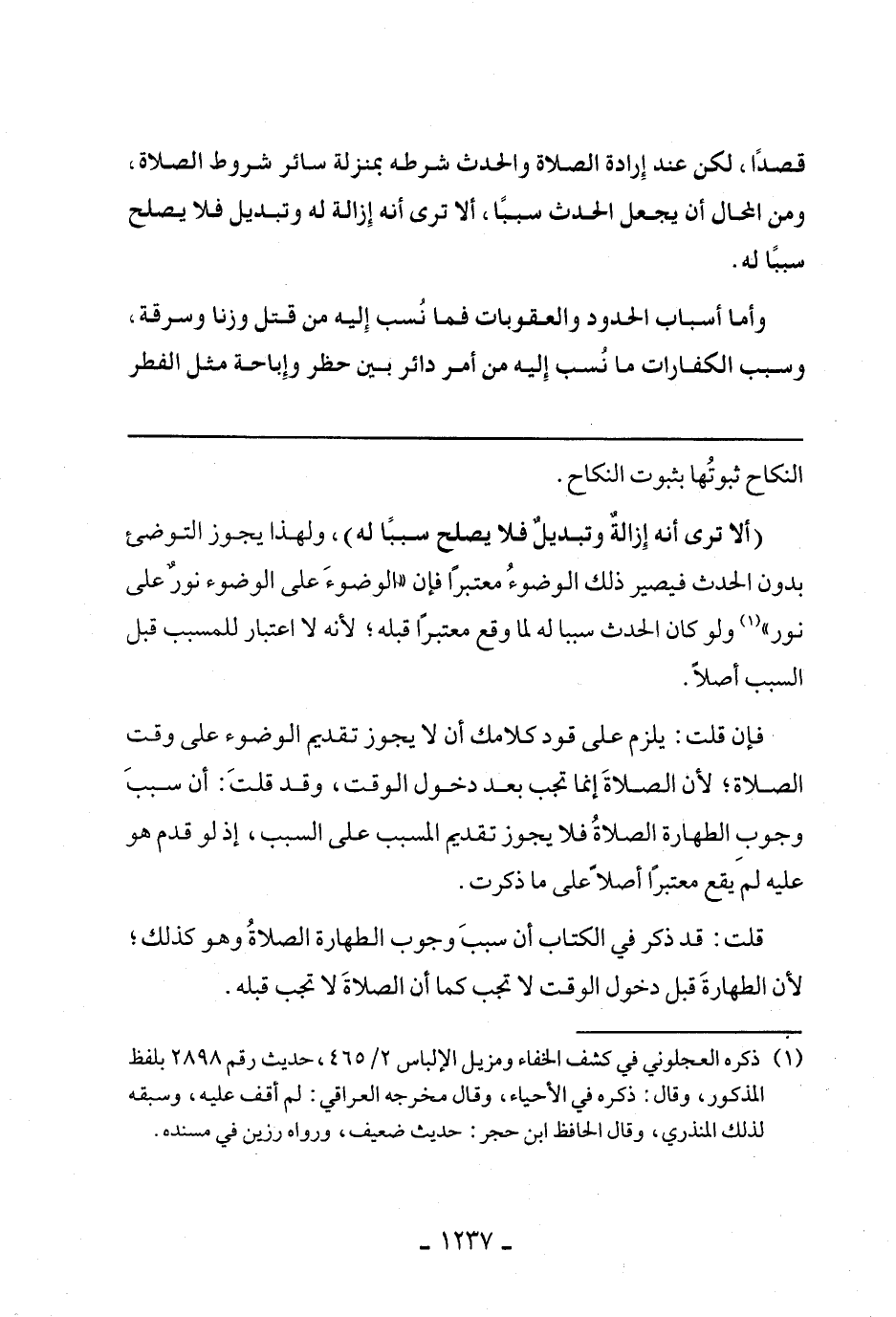 (ألا ترى أنه إزالة وتبديل فلا يصلح سببًا له)، ولهذا يجوز التوضؤ بدون الحدث فيصير ذلك الوضوء معتبرًا فإن ((الوضوء على الوضوء نور على نور)) ولو كان الحدث سببًا لما وقع معتبرًا قبله؛ لأنه لا اعتبار للمسبب قبل السبب أصلًا.